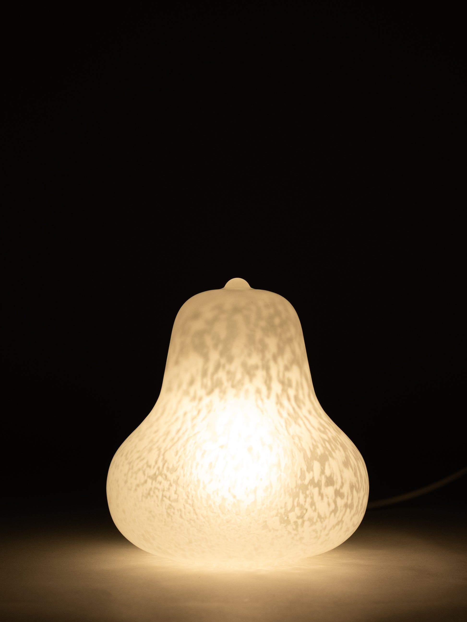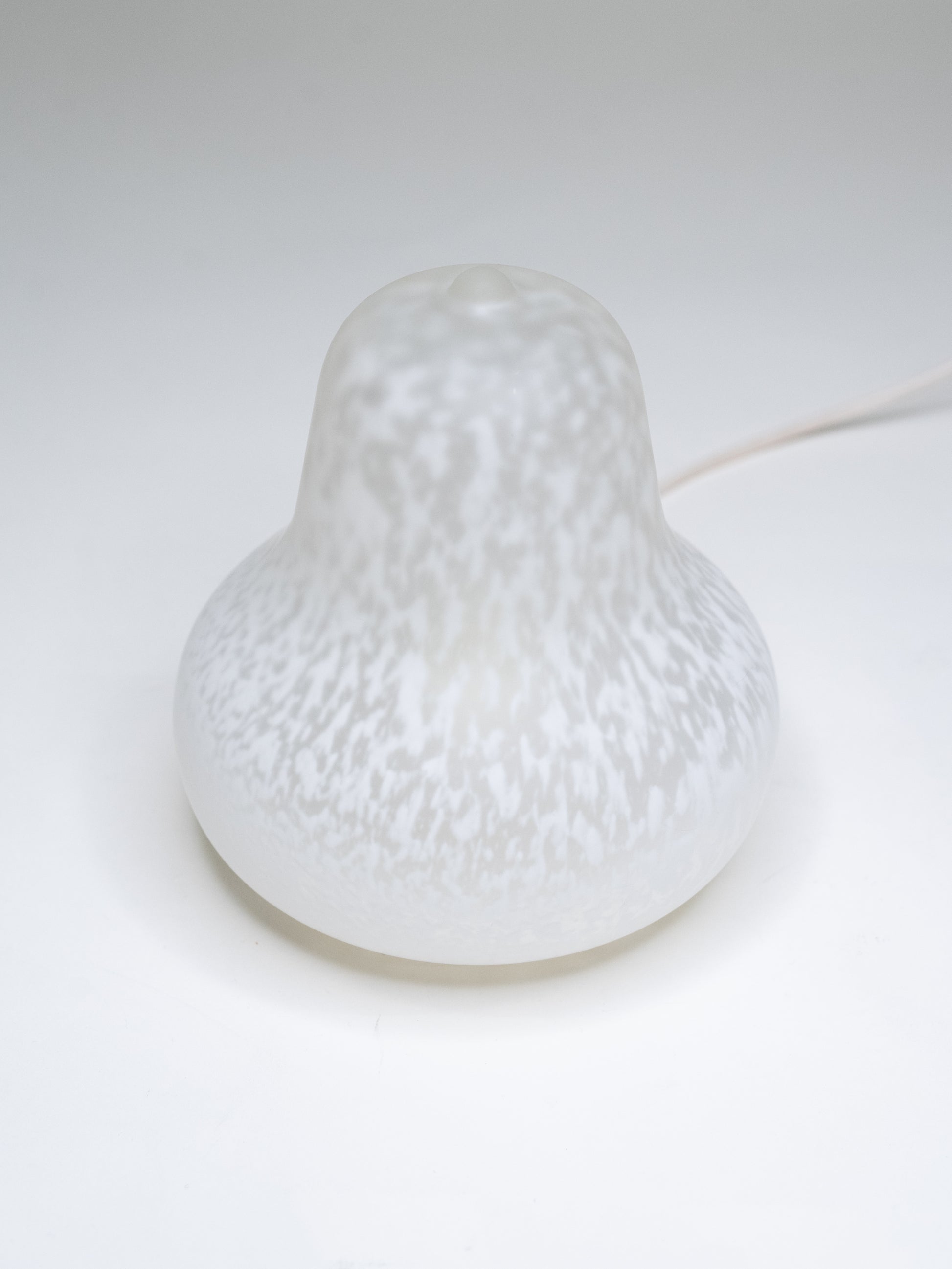 A table lamp designed by Monica Backström for LampGustaf in 1970s Sweden. Made from white mottled glass, with a softly rounded, pear-like form that sits low and wide.