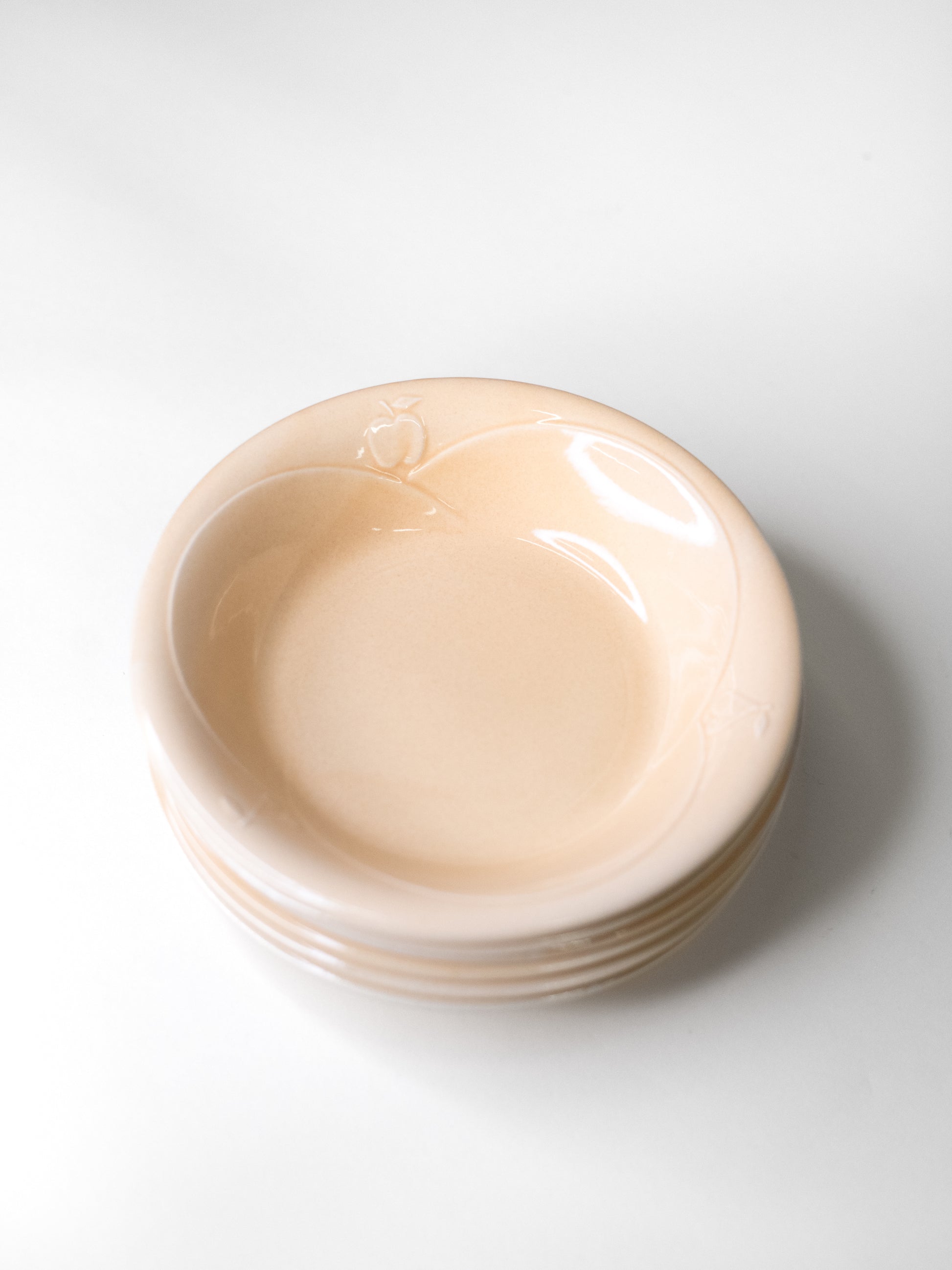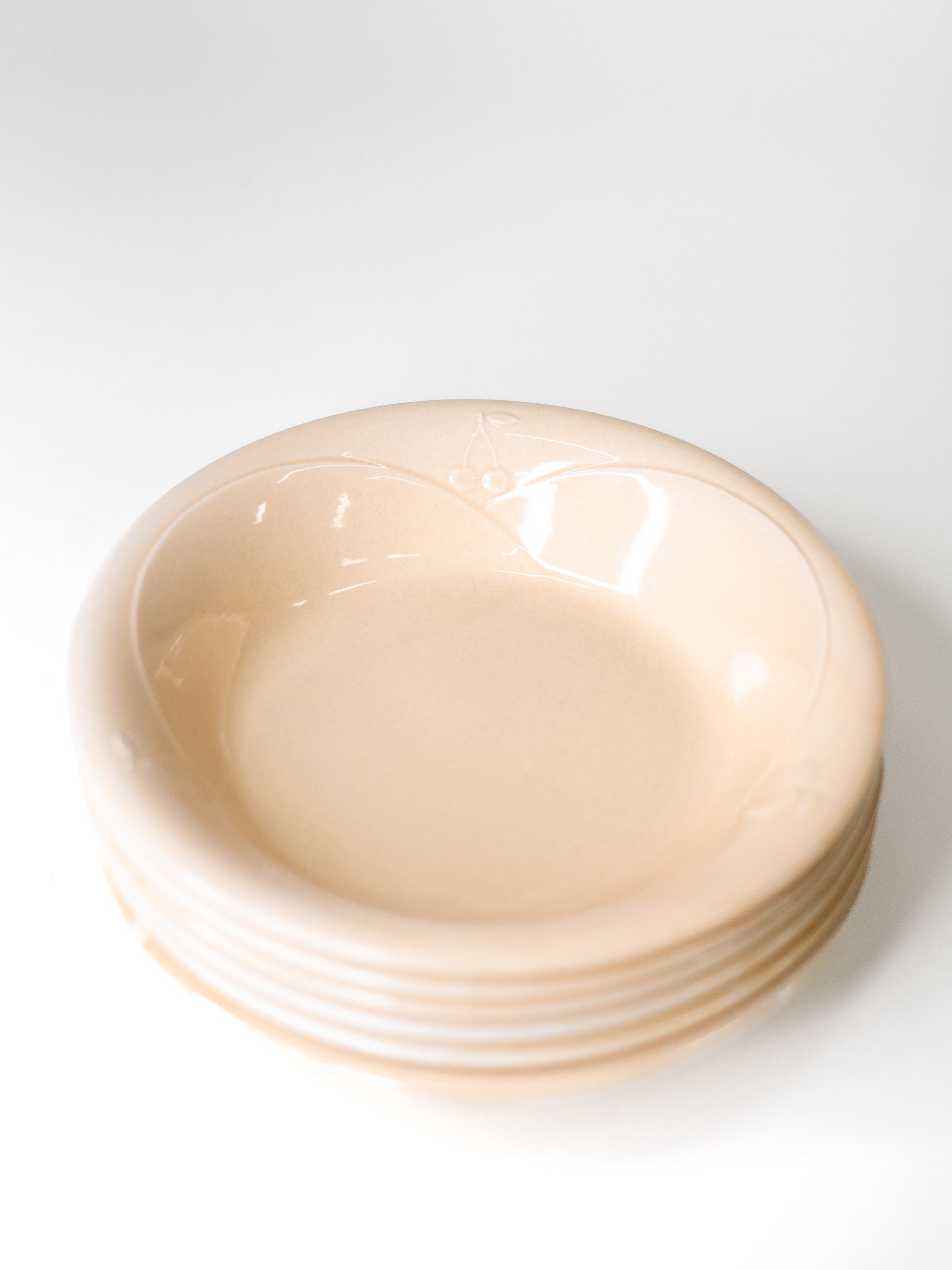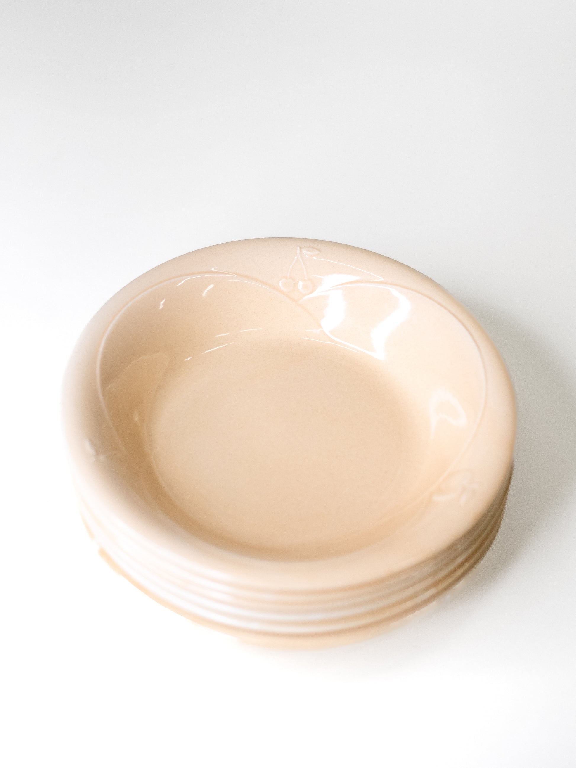 A quirky set of six vintage Italian plates, glazed in a warm pale peach tone with delicate relief motifs of cherries, pears, and apples. Subtle and decorative, they echo the easy charm of an Italian holiday - sun-washed ceramics with a resort mood that makes even a simple meal feel special.