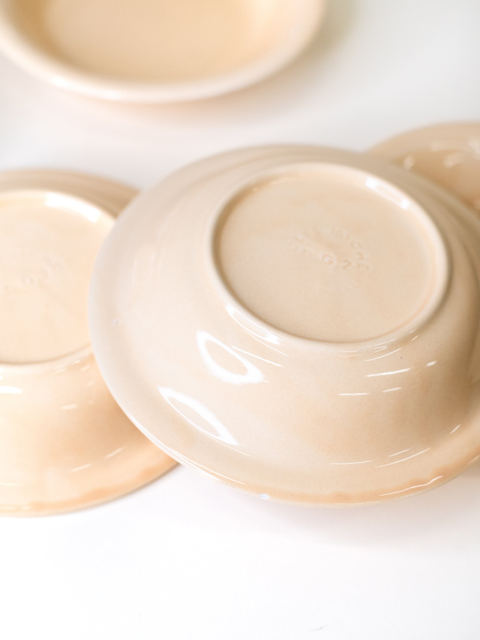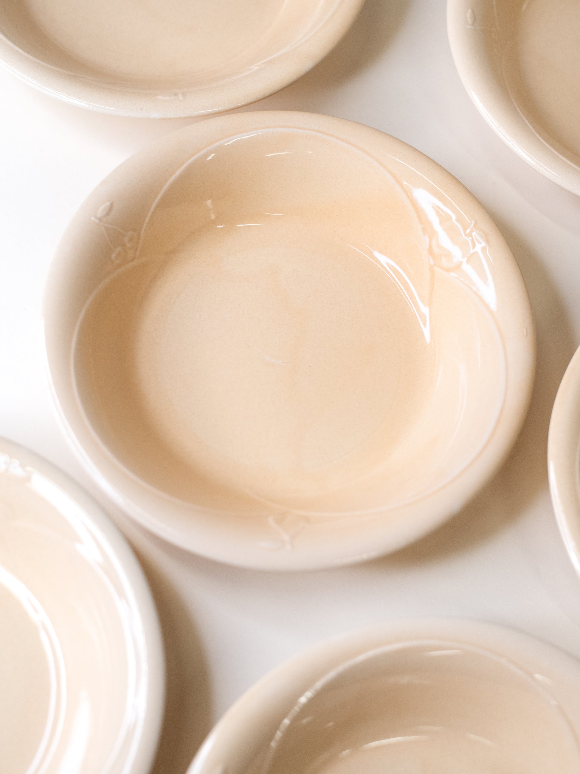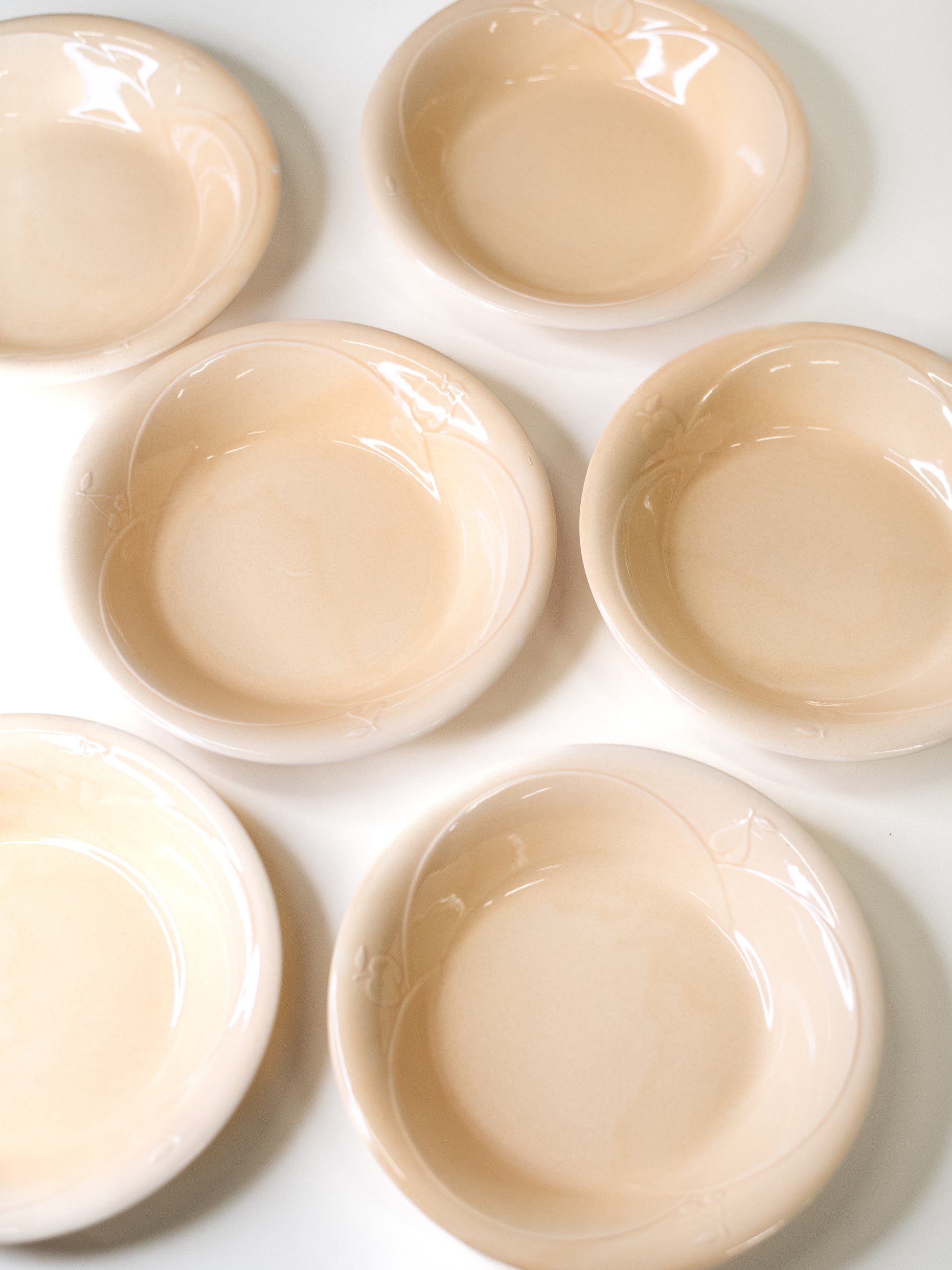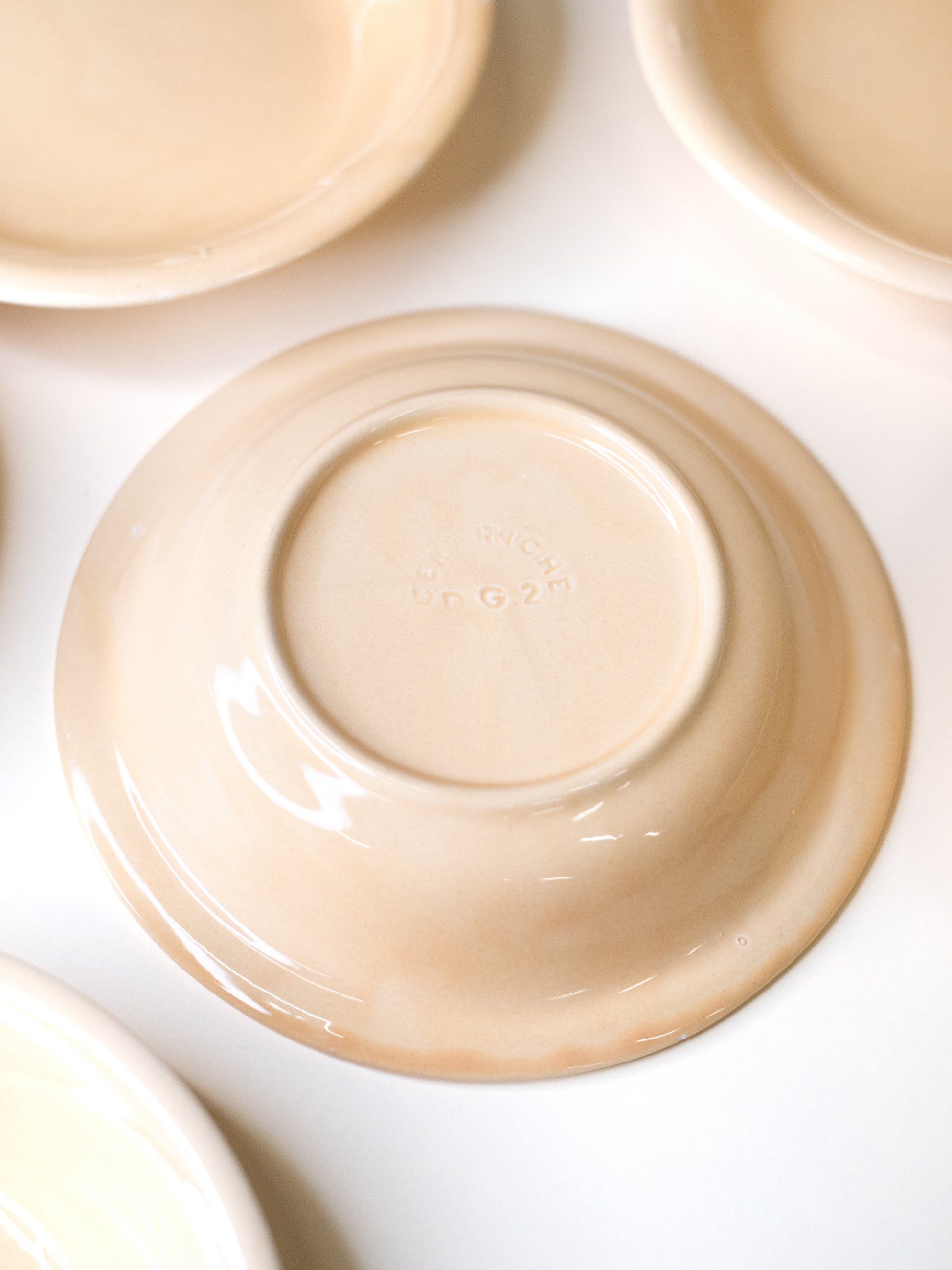 A quirky set of six vintage Italian plates, glazed in a warm pale peach tone with delicate relief motifs of cherries, pears, and apples. Subtle and decorative, they echo the easy charm of an Italian holiday - sun-washed ceramics with a resort mood that makes even a simple meal feel special.