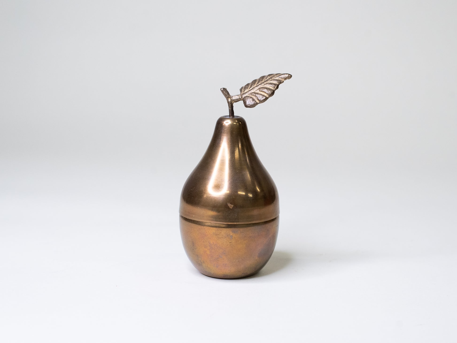 Lightweight and beautifully aged, this pear-shaped brass box captures the charm of decorative metalwork from the midcentury era. The spun brass body has a warm, even patina, topped with a finely cast leaf that adds a sculptural finish.