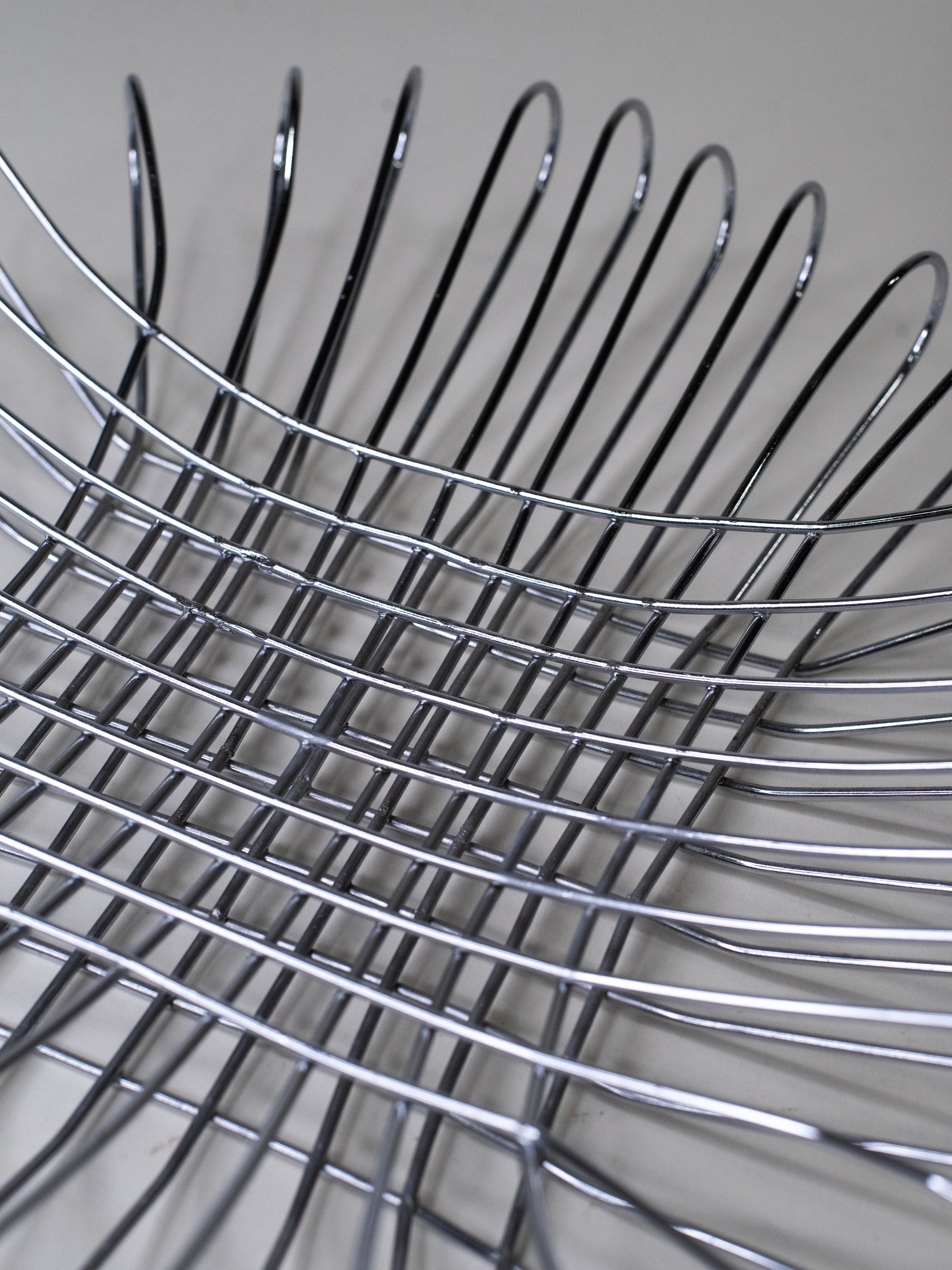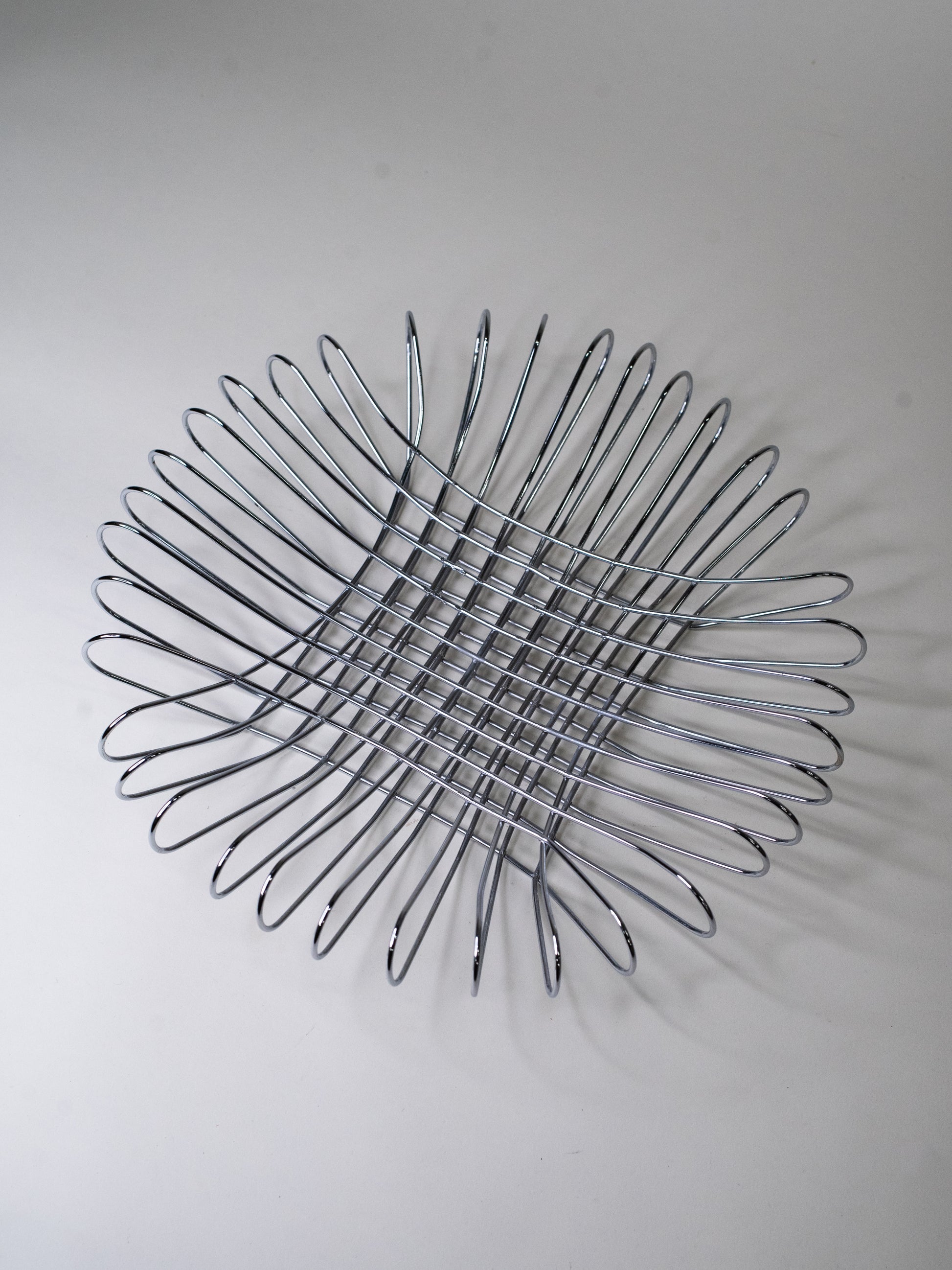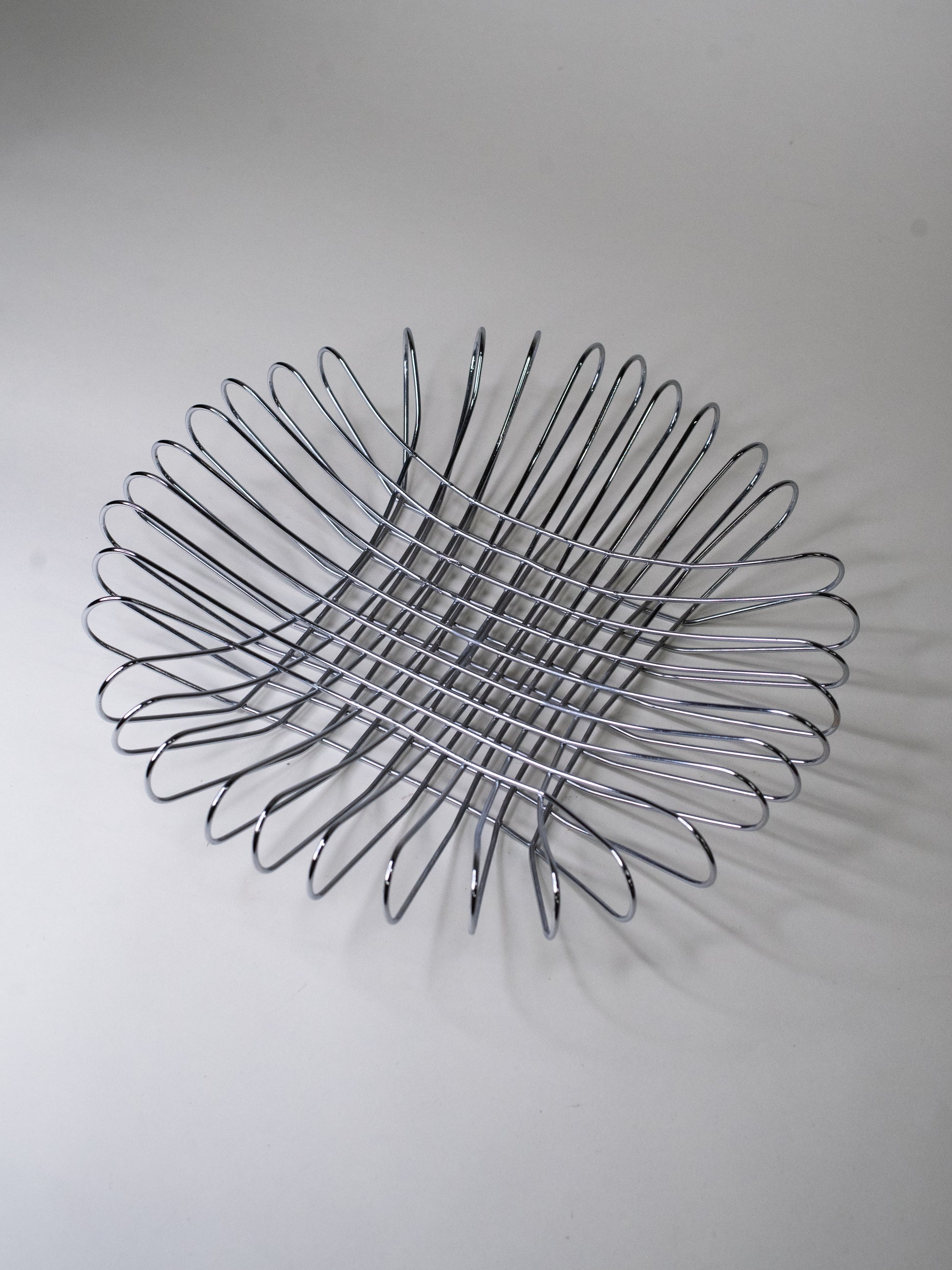 A sleek fruit bowl hand-crafted from chrome-plated steel wire. The open loops form a light grid that curves upward with quiet precision and rhythm. Look closely and you’ll see tiny irregularities where the wire bends and joins, proof that this one wasn’t made by a machine alone.