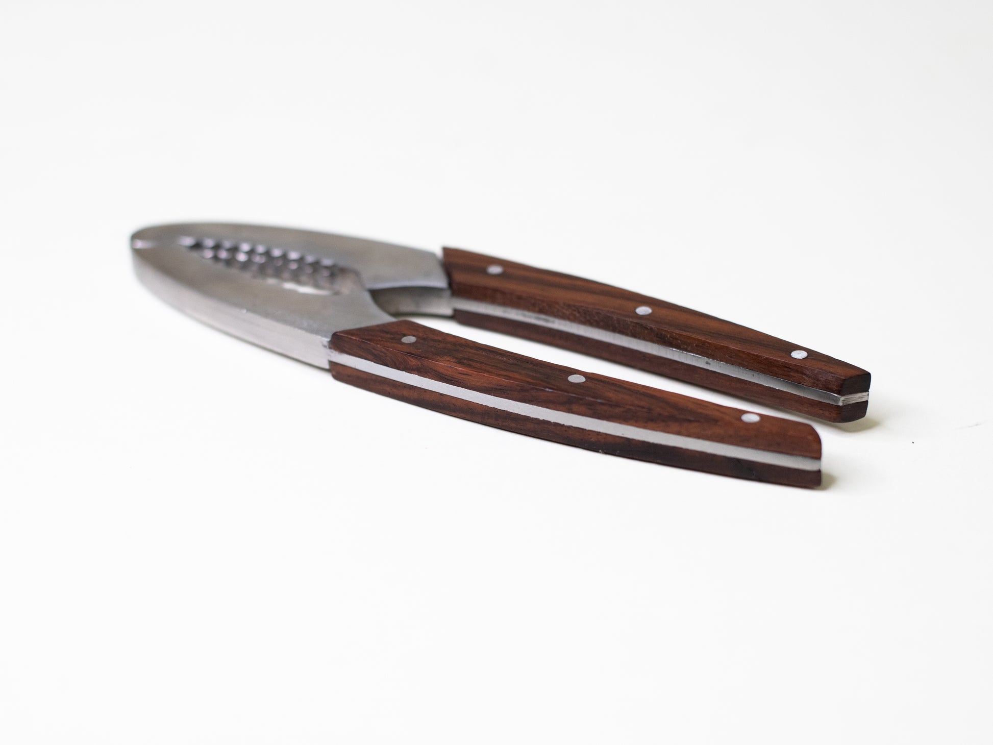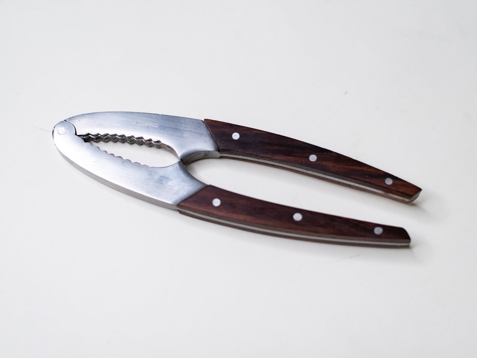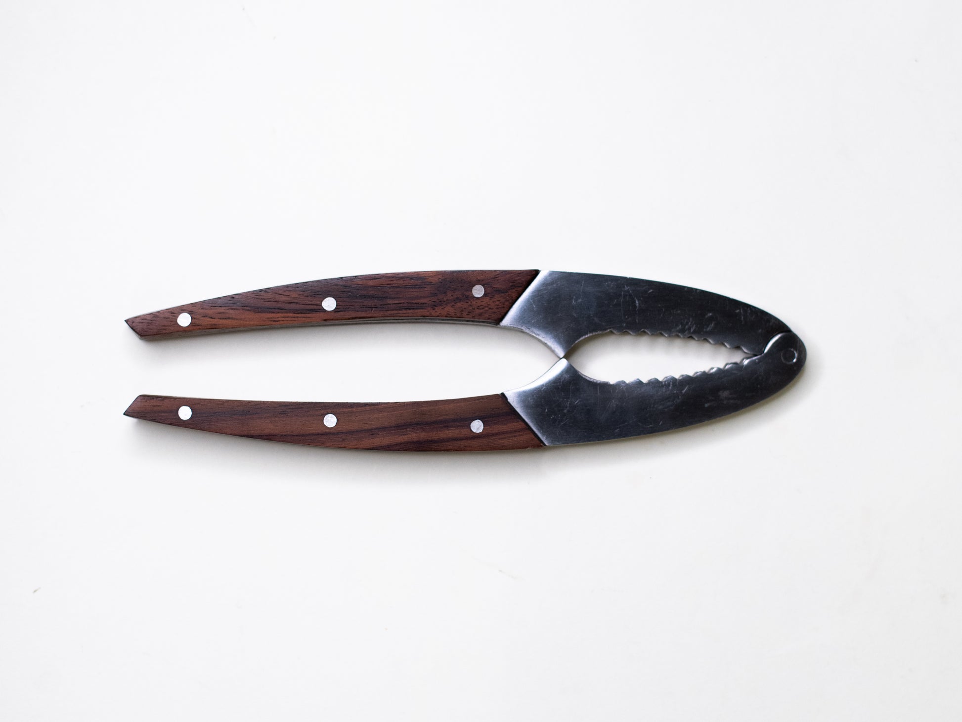 A beautifully made mid-century nutcracker with stainless steel jaws and smooth wooden handles, fastened with steel rivets. Sturdy and well-balanced - proof that even the most practical tools can be elegant.