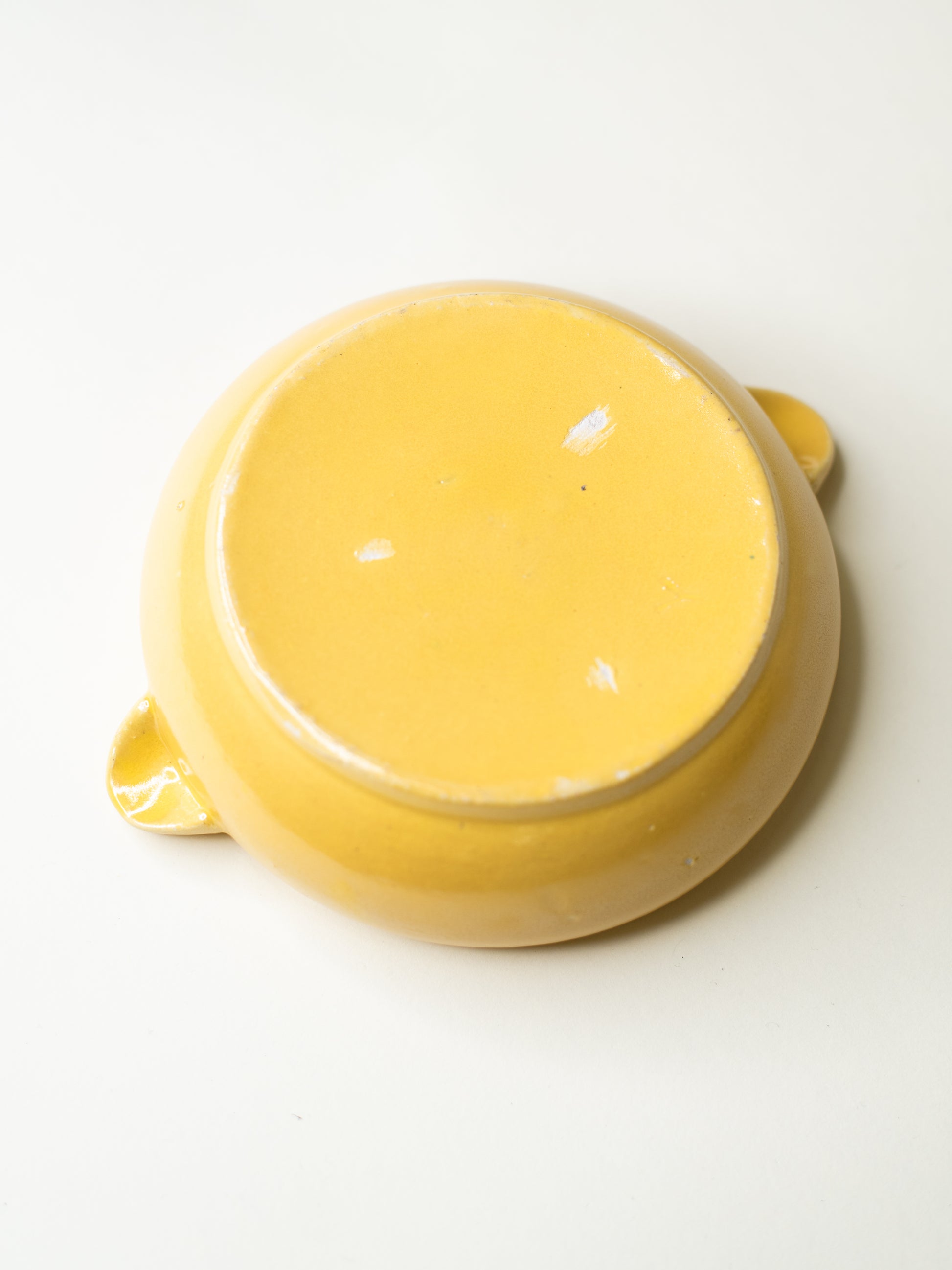 A compact, low-profile bowl in a vibrant yellow glaze, complete with two small side handles. The form is simple yet full of character - the kind of everyday object that carries a quiet modernist confidence.