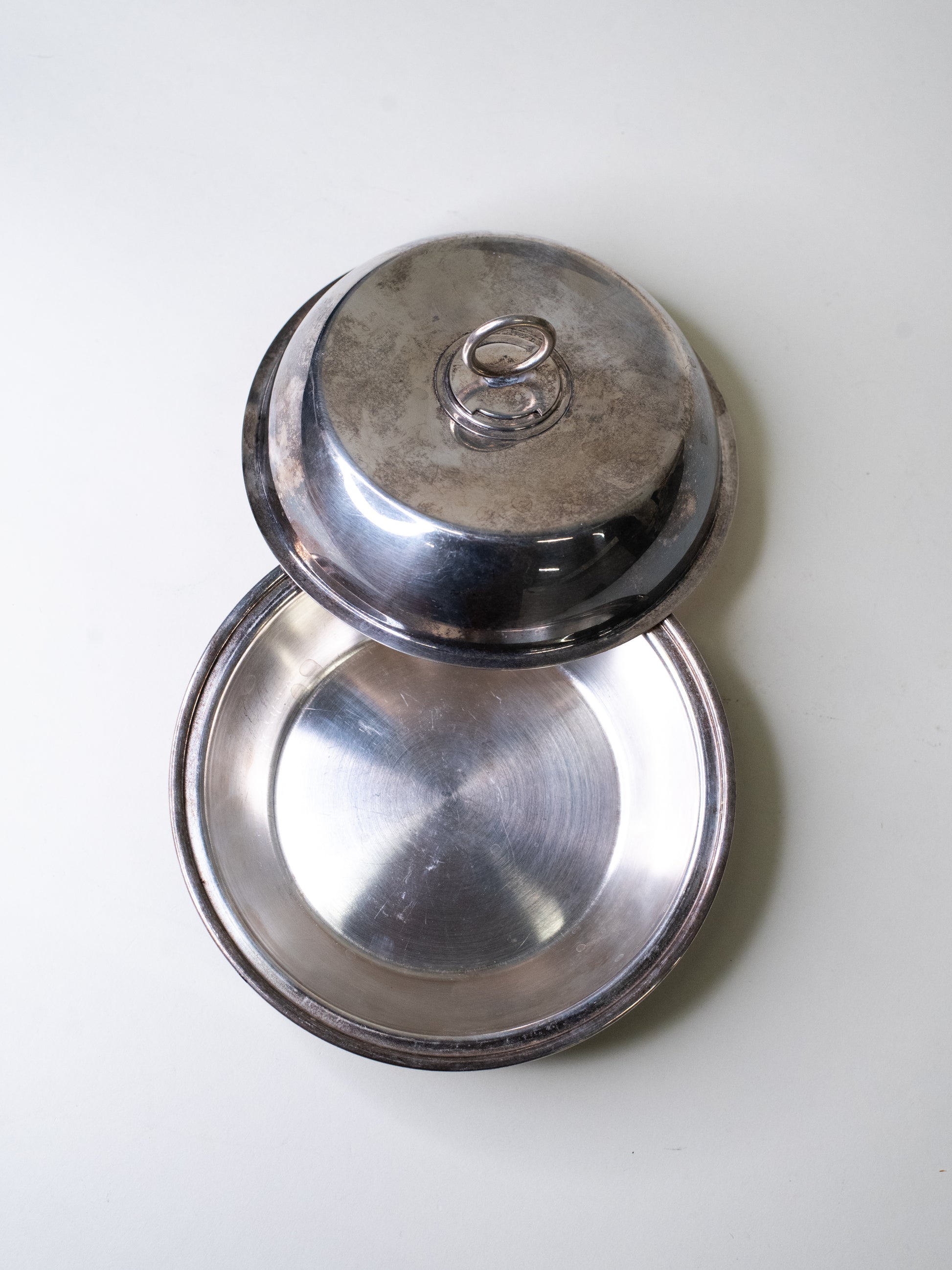 A beautifully old-school lidded dish with that classic hotel-silver silhouette: a rounded dome lid with a ring handle, and a deep bowl that feels both practical and quietly glamorous. The form is simple but striking — the kind of piece that looks good anywhere, from a kitchen shelf to a bar cart. These are surprisingly hard to find in this shape and proportion.