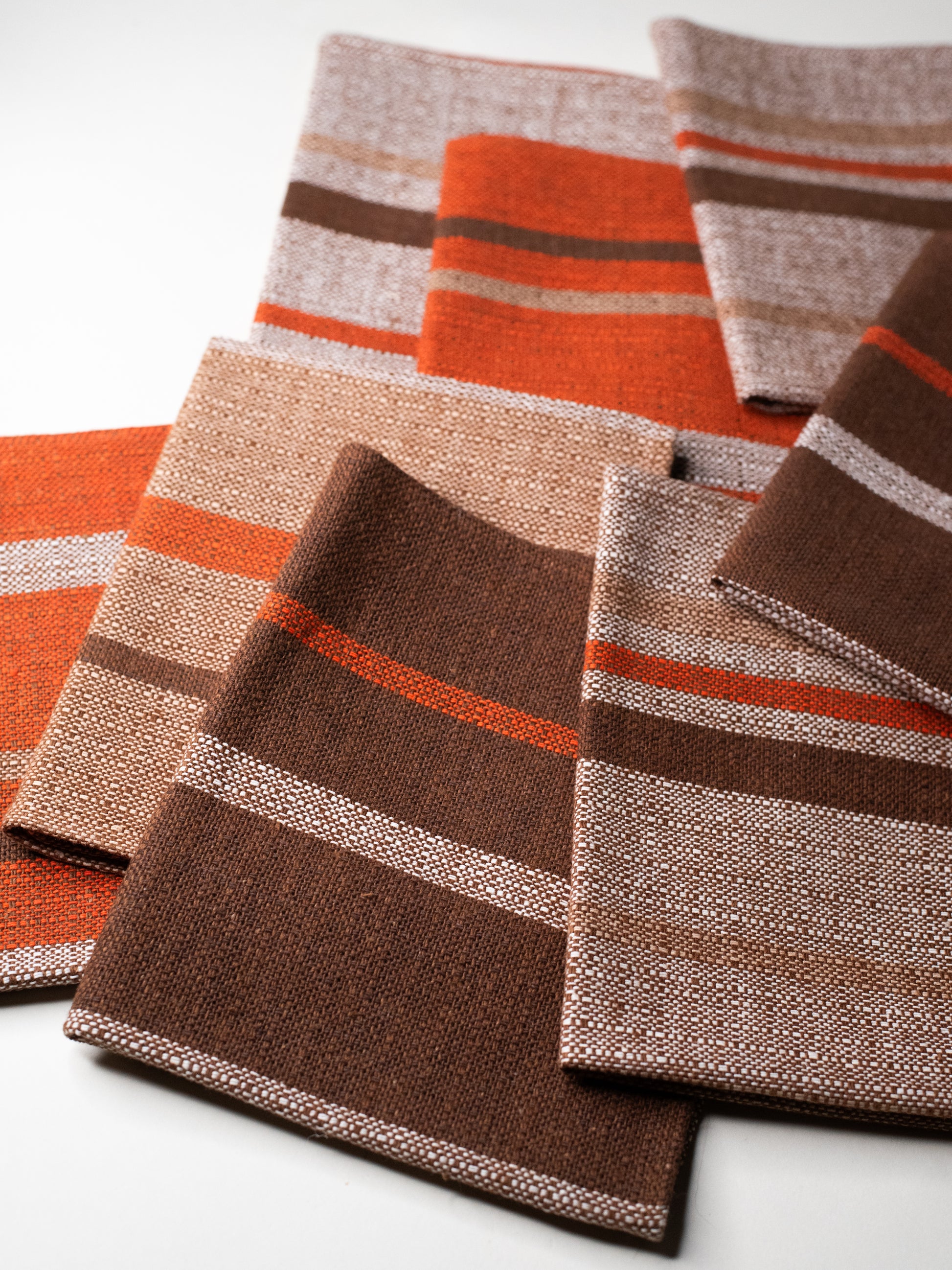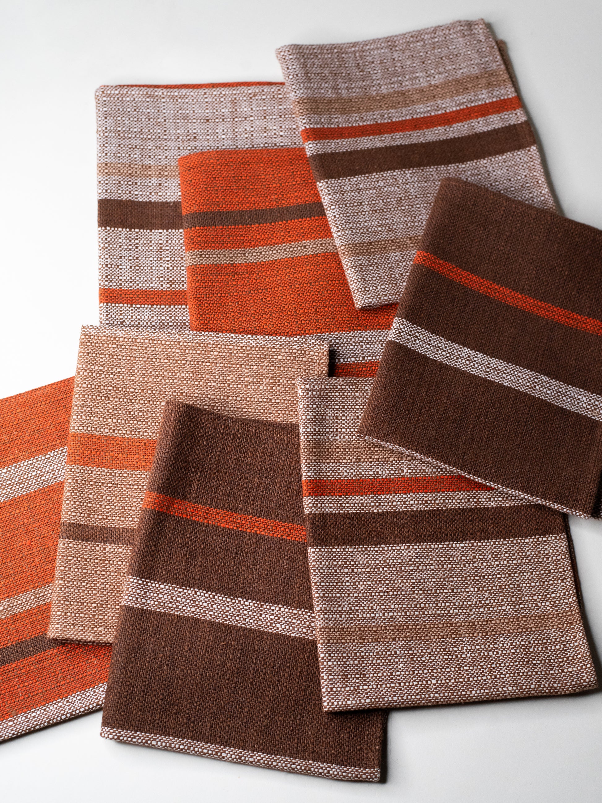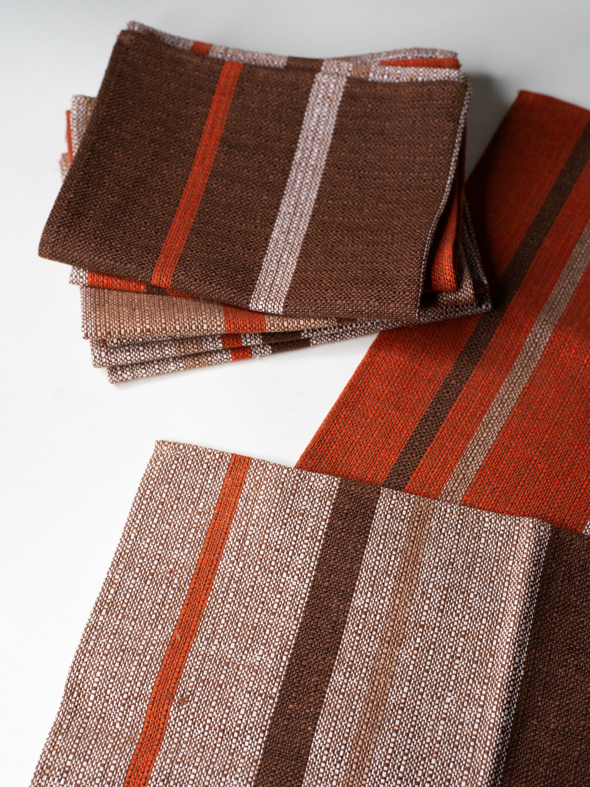 The fabric itself is sturdy and finely woven, with a firm weave and a lightly textured feel, closer to linen than soft cotton. The stripe placement varies subtly from one mat to the next - some lean more orange, others more brown - which gives the set a relaxed, lived-in feel. Calm and confident, but not loud.