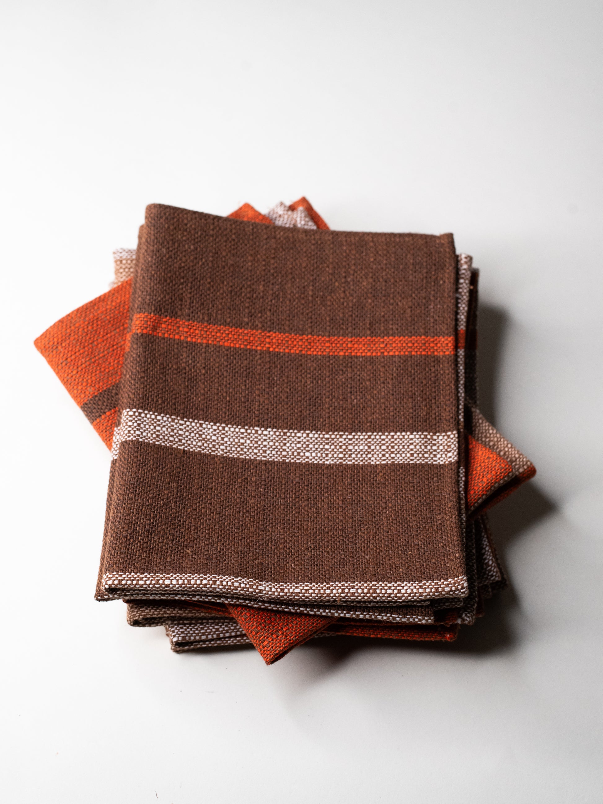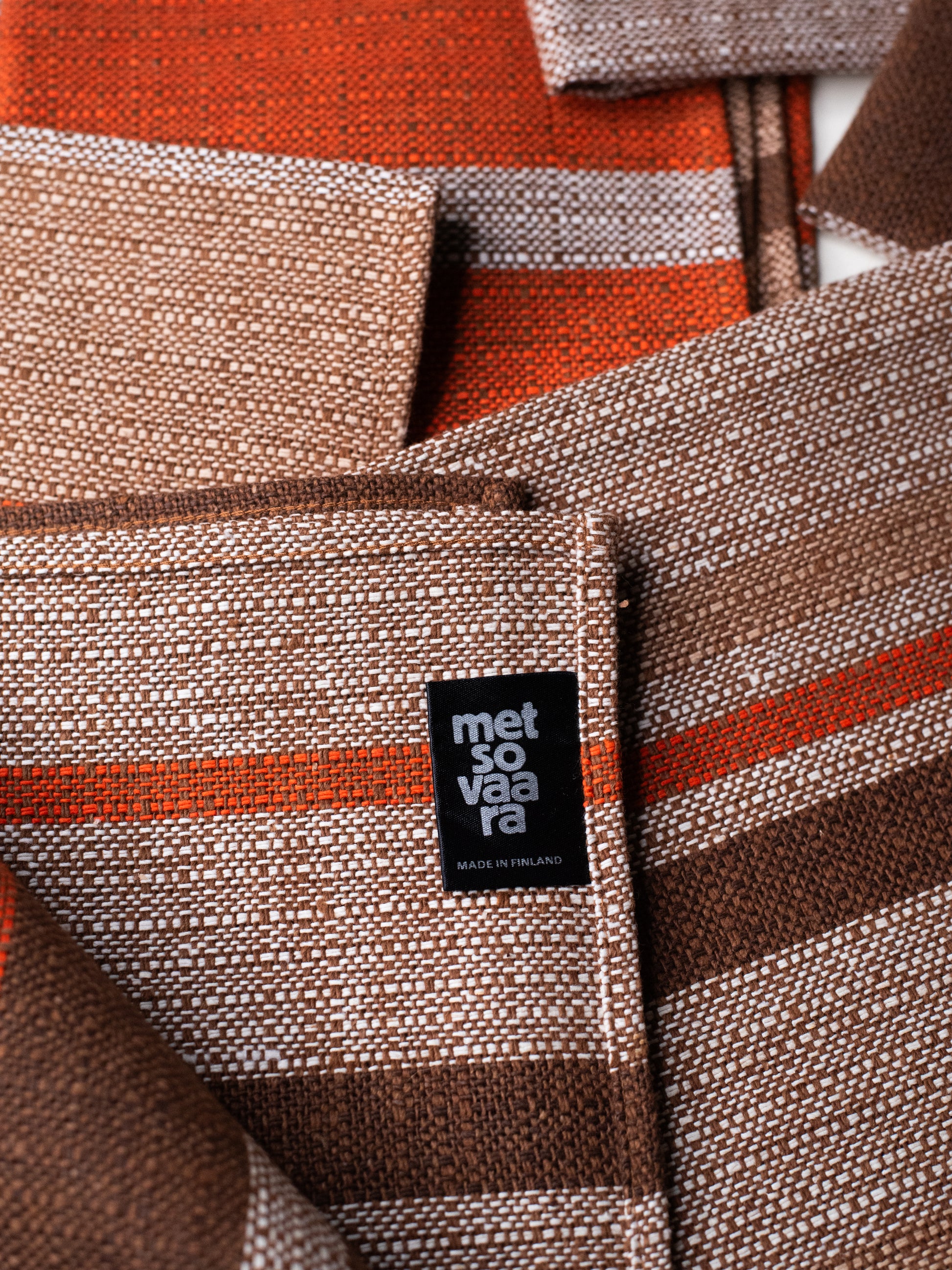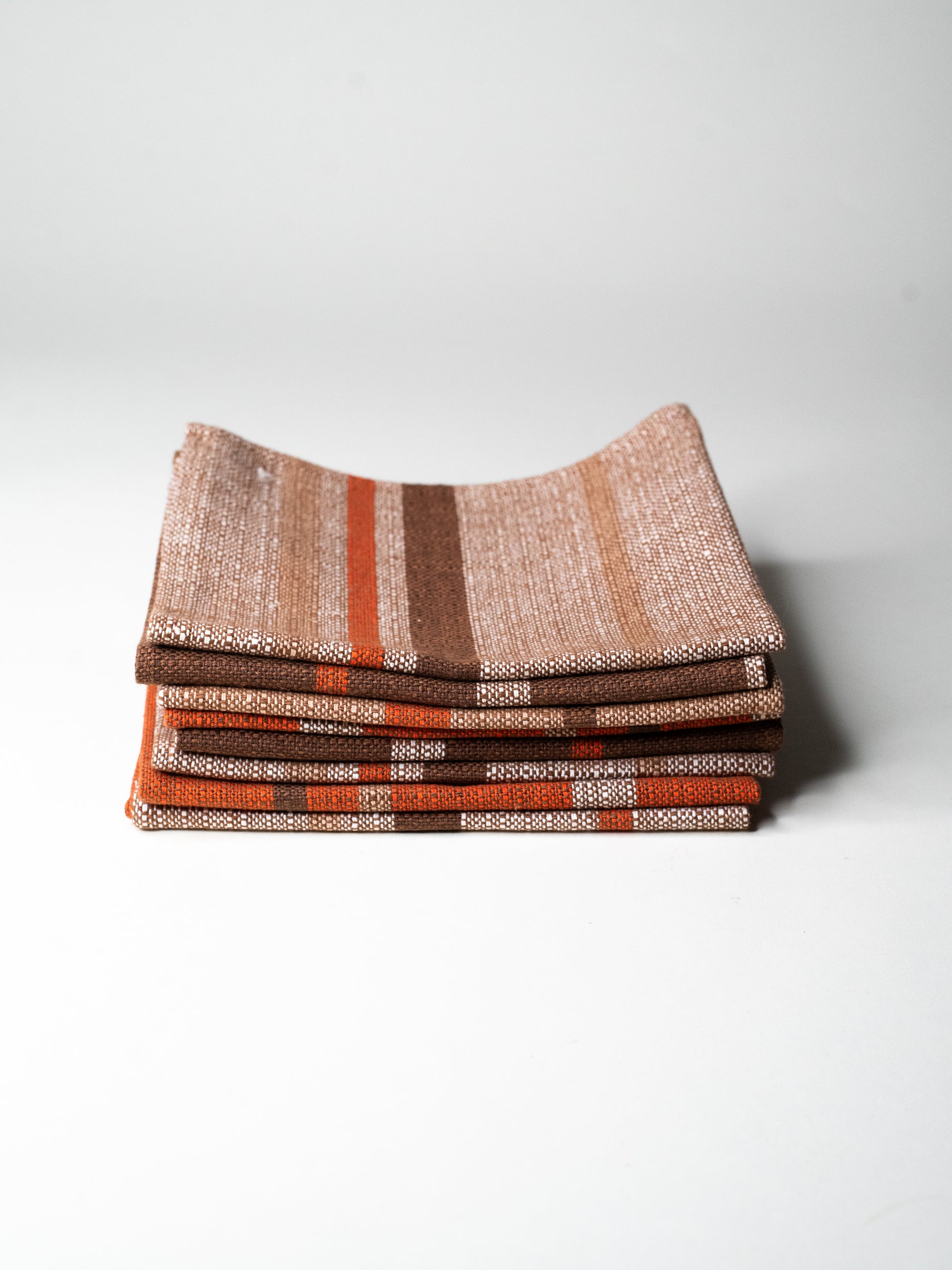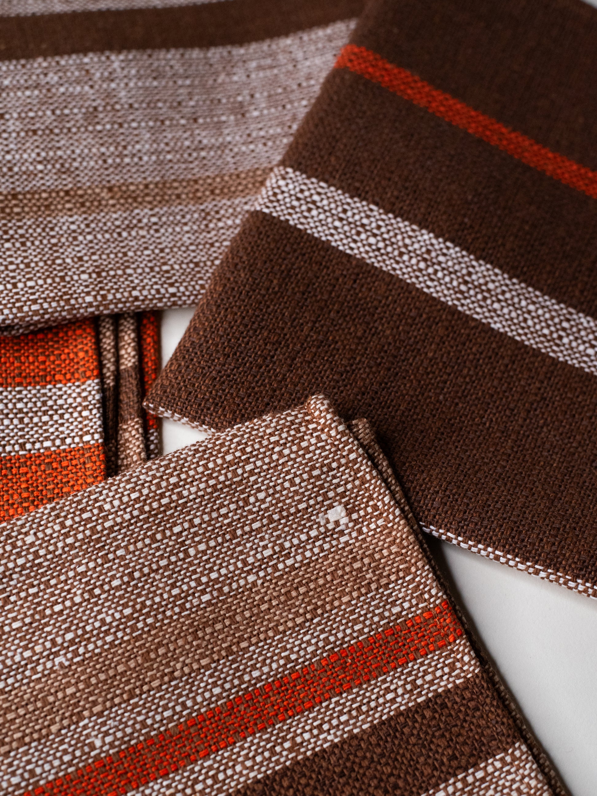The fabric itself is sturdy and finely woven, with a firm weave and a lightly textured feel, closer to linen than soft cotton. The stripe placement varies subtly from one mat to the next - some lean more orange, others more brown - which gives the set a relaxed, lived-in feel. Calm and confident, but not loud.
