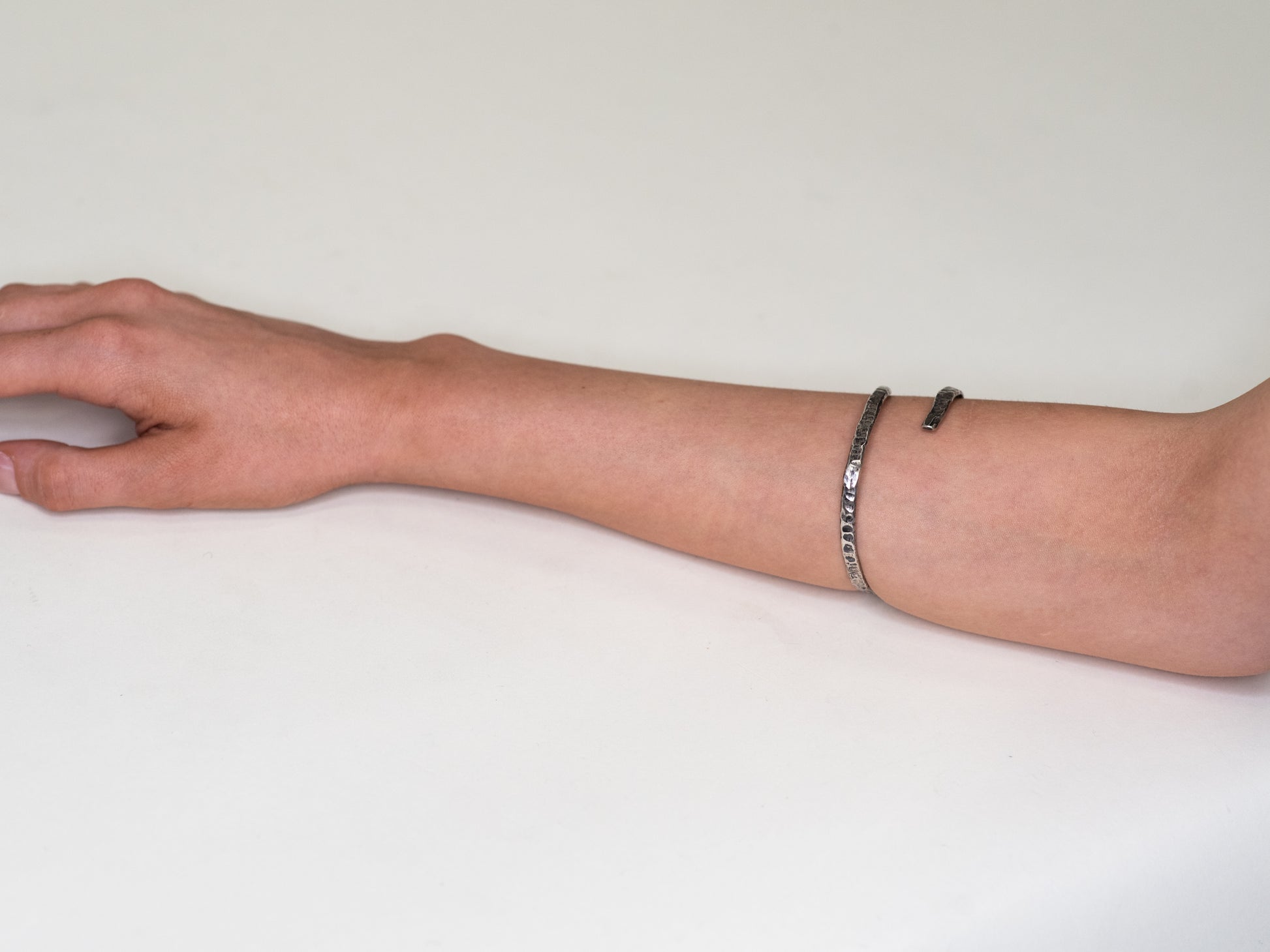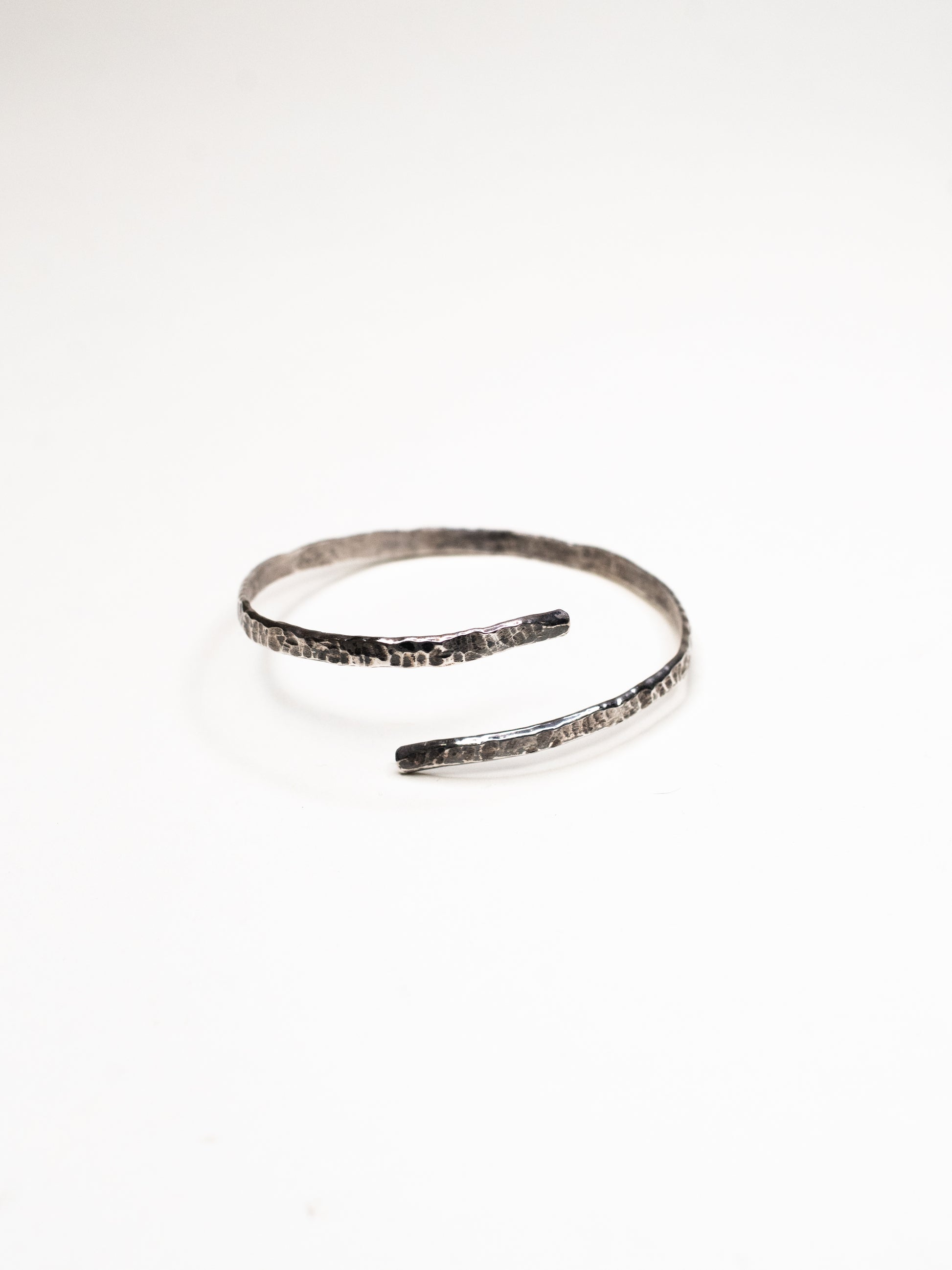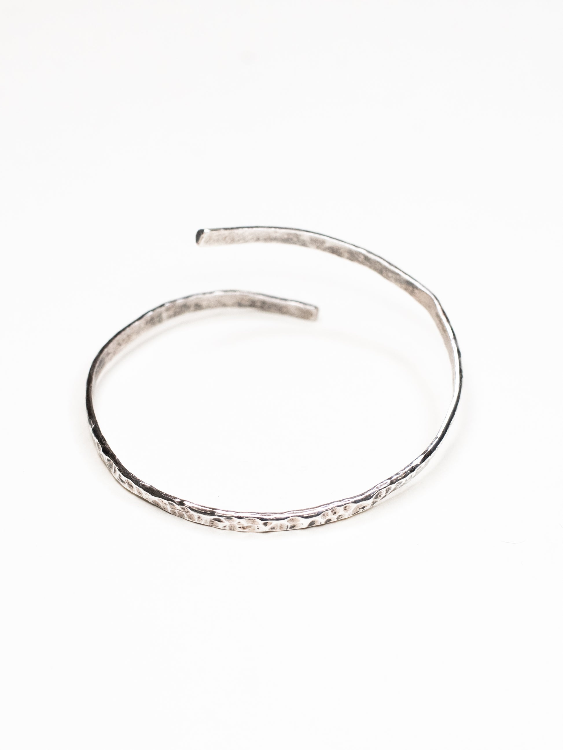 A minimal vintage silver bracelet with an organic, sculptural feel. Hand-hammered surface with a raw, modernist aesthetic. Understated, yet full of character. The subtle asymmetry and raw finish are typical to small-scale production and individual craftsmanship.
