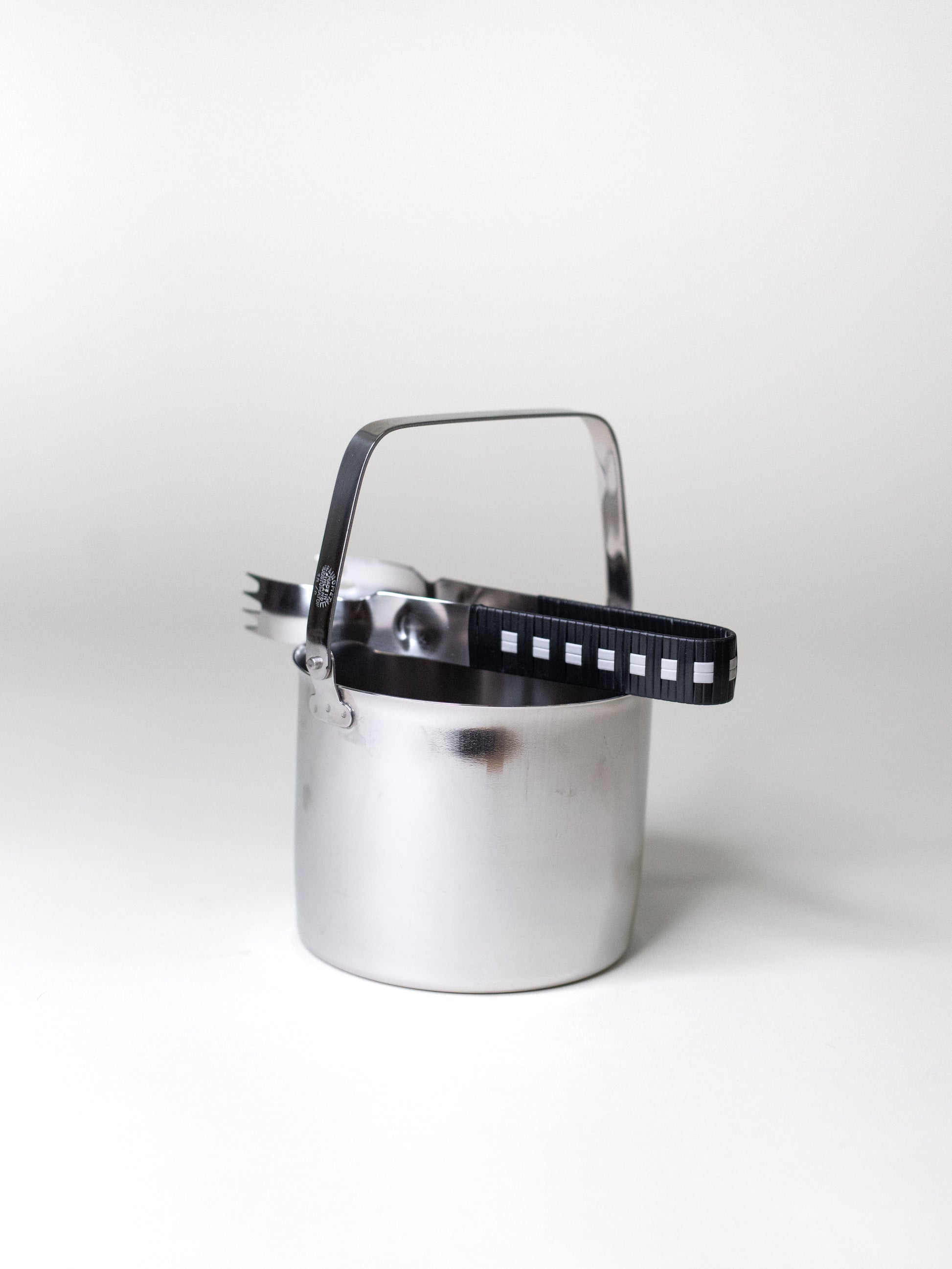 A sleek stainless steel ice bucket made in Finland by Painometalli. The bucket comes with a removable perforated insert to keep the ice fresh and dry. The set includes stainless steel tongs with a black vinyl-wrapped handle and white accents - a practical detail that adds both grip and style. Together they form a compact, durable, and timeless bar set.