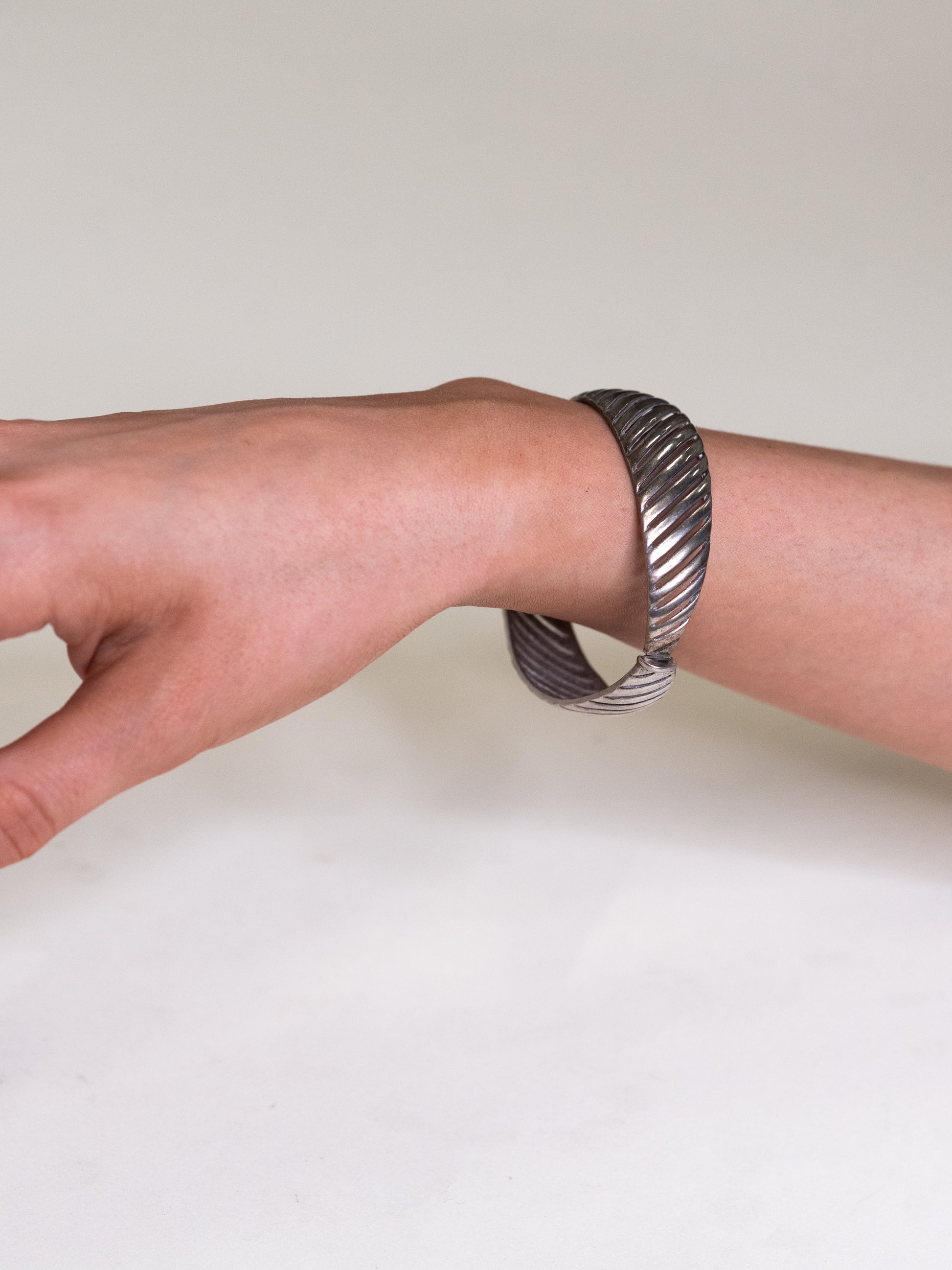 A solid, well-made silver bracelet with a crisp cut-out pattern that plays beautifully with light and shadow. The design feels graphic but soft at the same time — strong lines, rounded edges, and a shape that sits comfortably on the wrist. Made from sterling silver with a neatly integrated hinged closure that disappears into the form when worn.