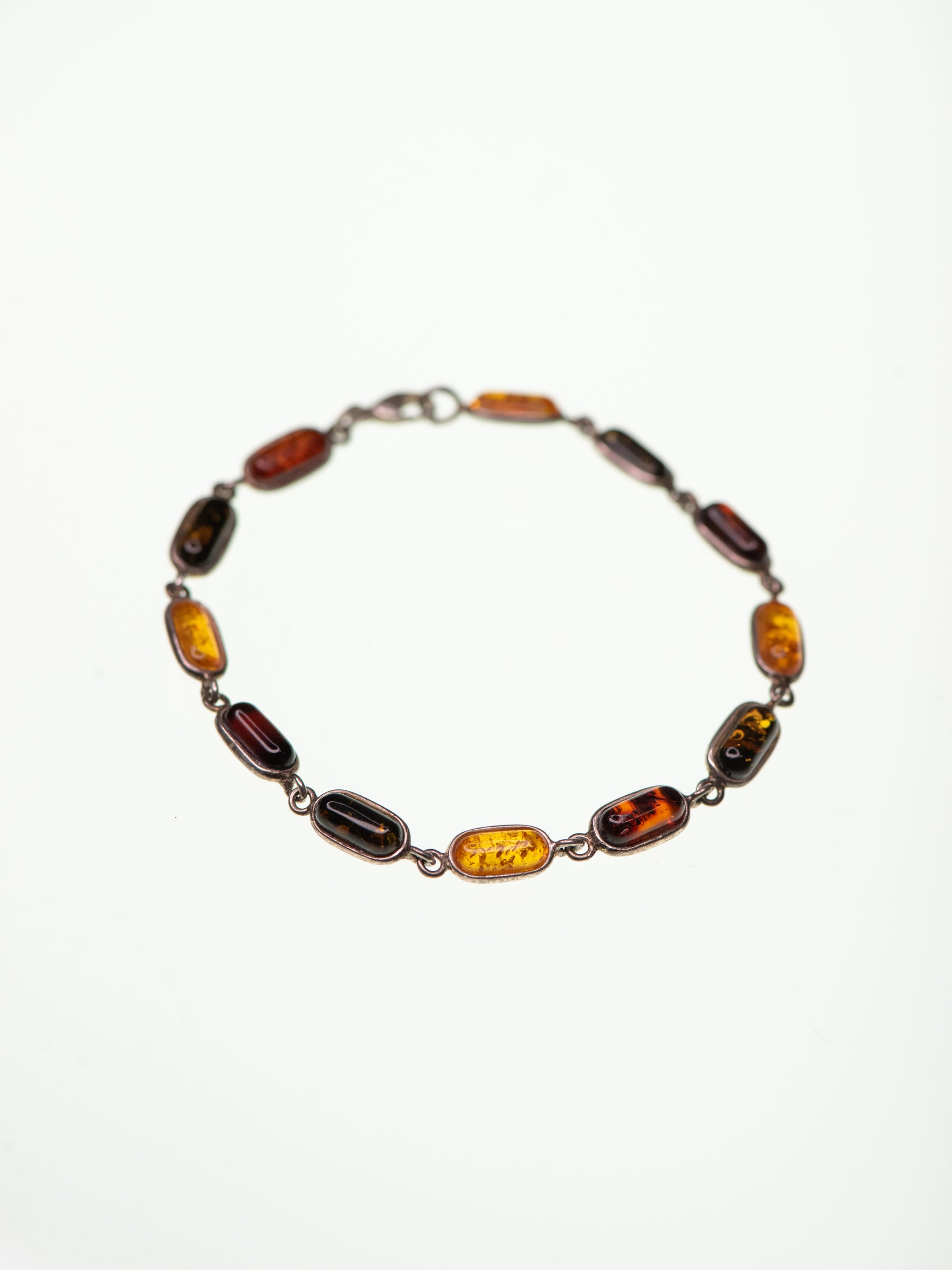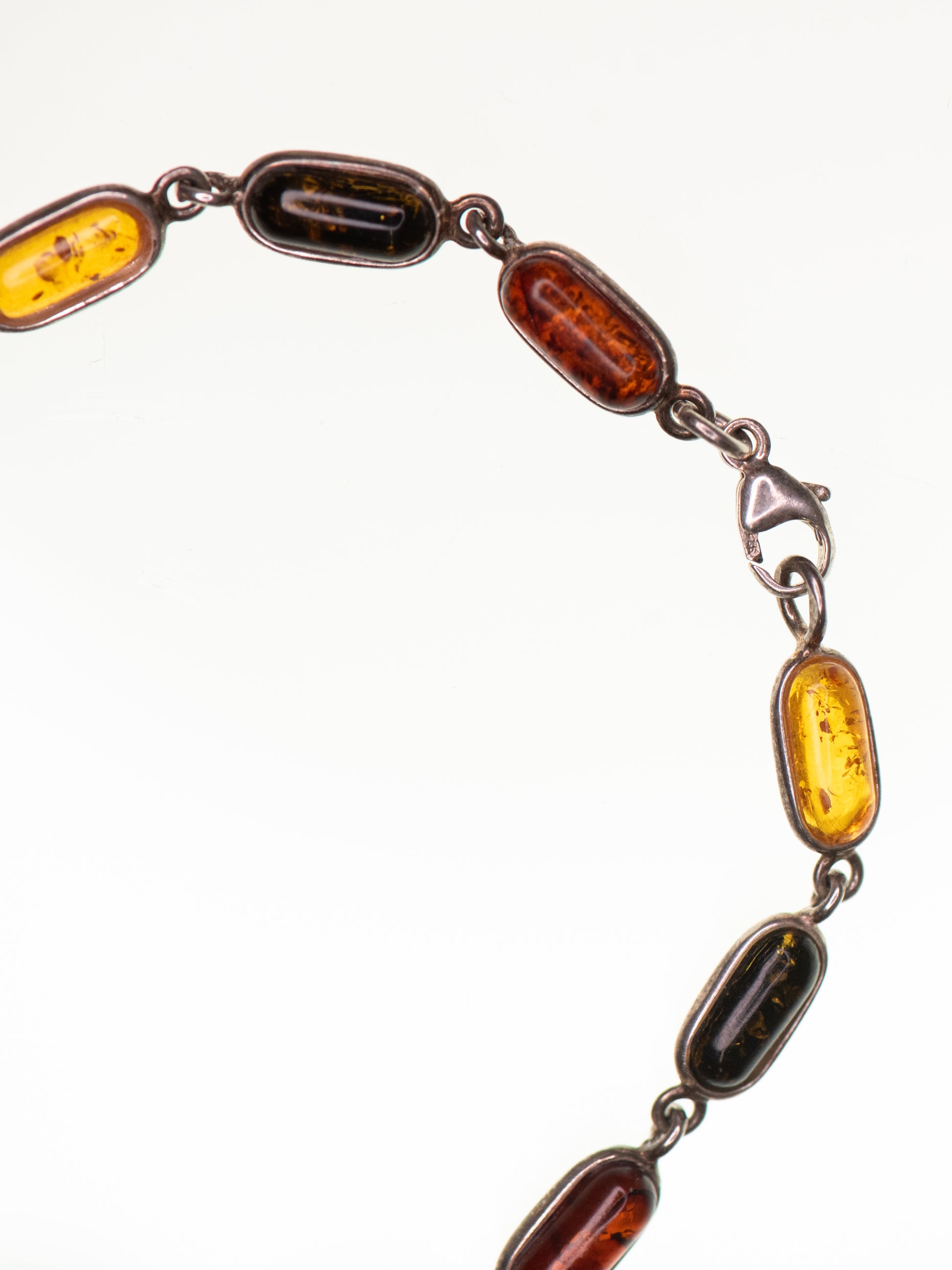 A slim silver bracelet set with elongated oval cabochons in warm amber tones - honey yellow, deep cognac, and darker brown notes alternating along the line. The stones are modest in size but rich in colour, giving the piece movement and a gentle rhythm.
