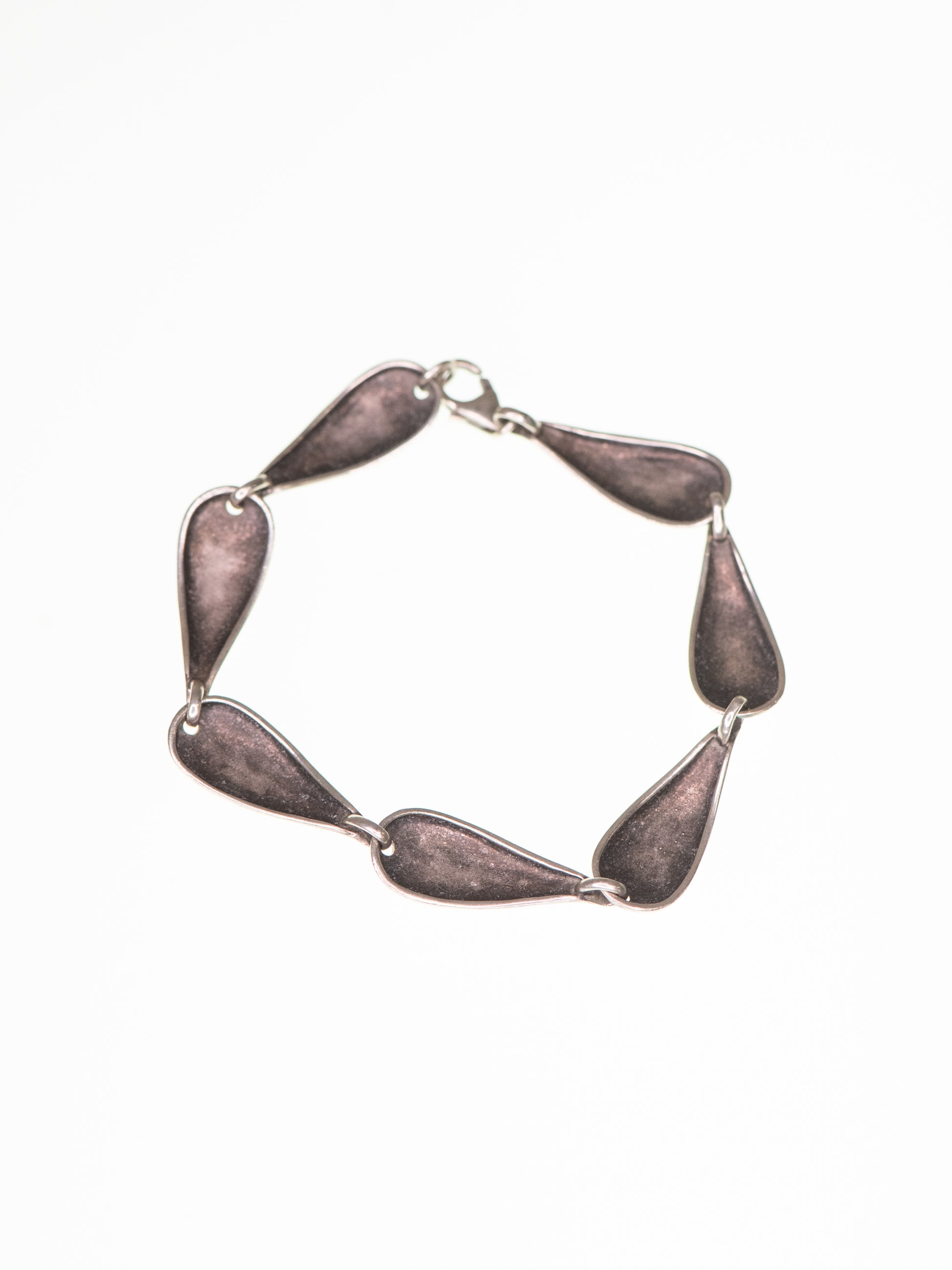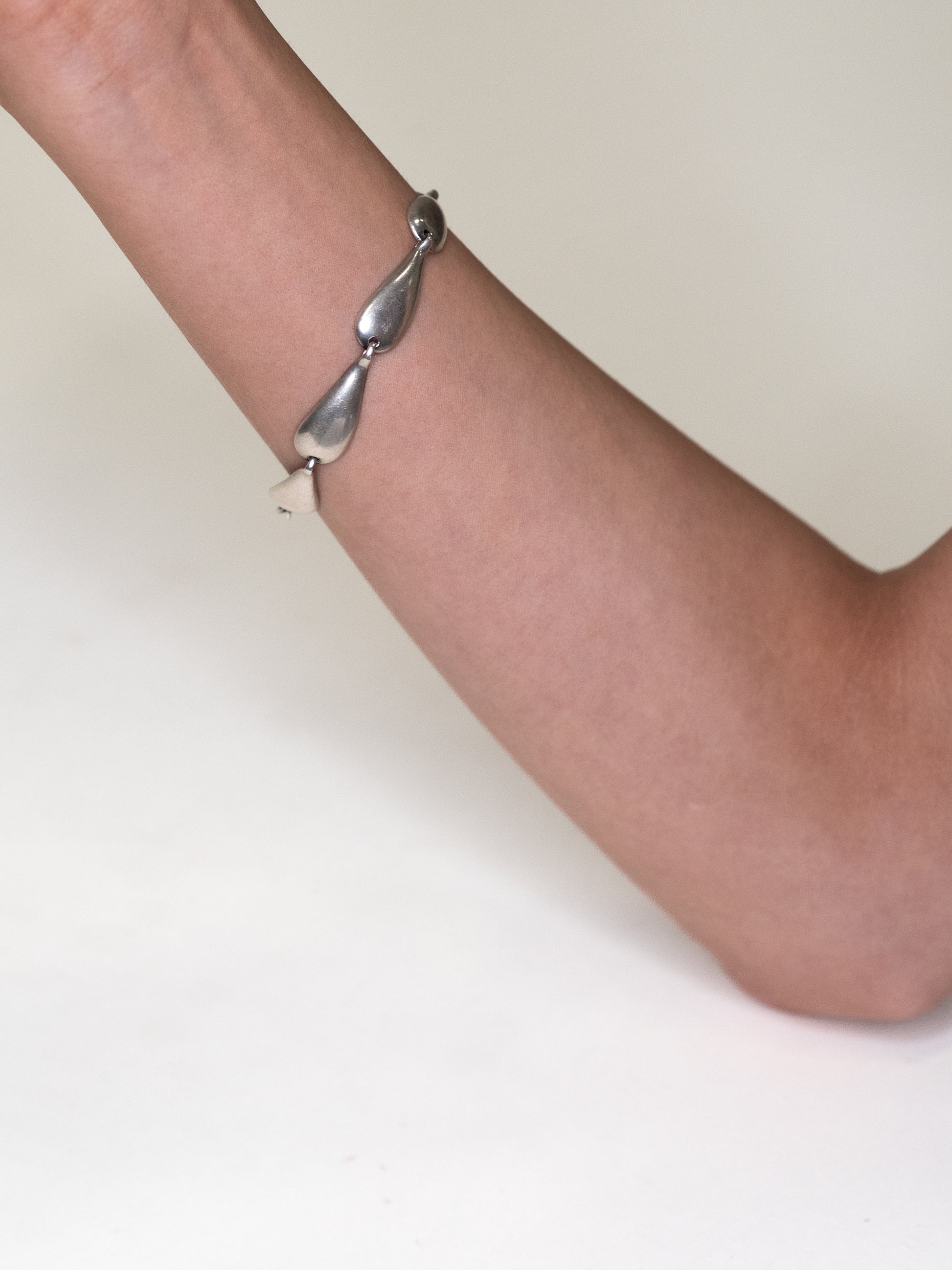A silver bracelet built from softly tapered teardrop links, each one slightly domed and gently rounded at the edges. The shape repeats around the wrist in an easy rhythm - smooth on the outside, darker and more matte within.