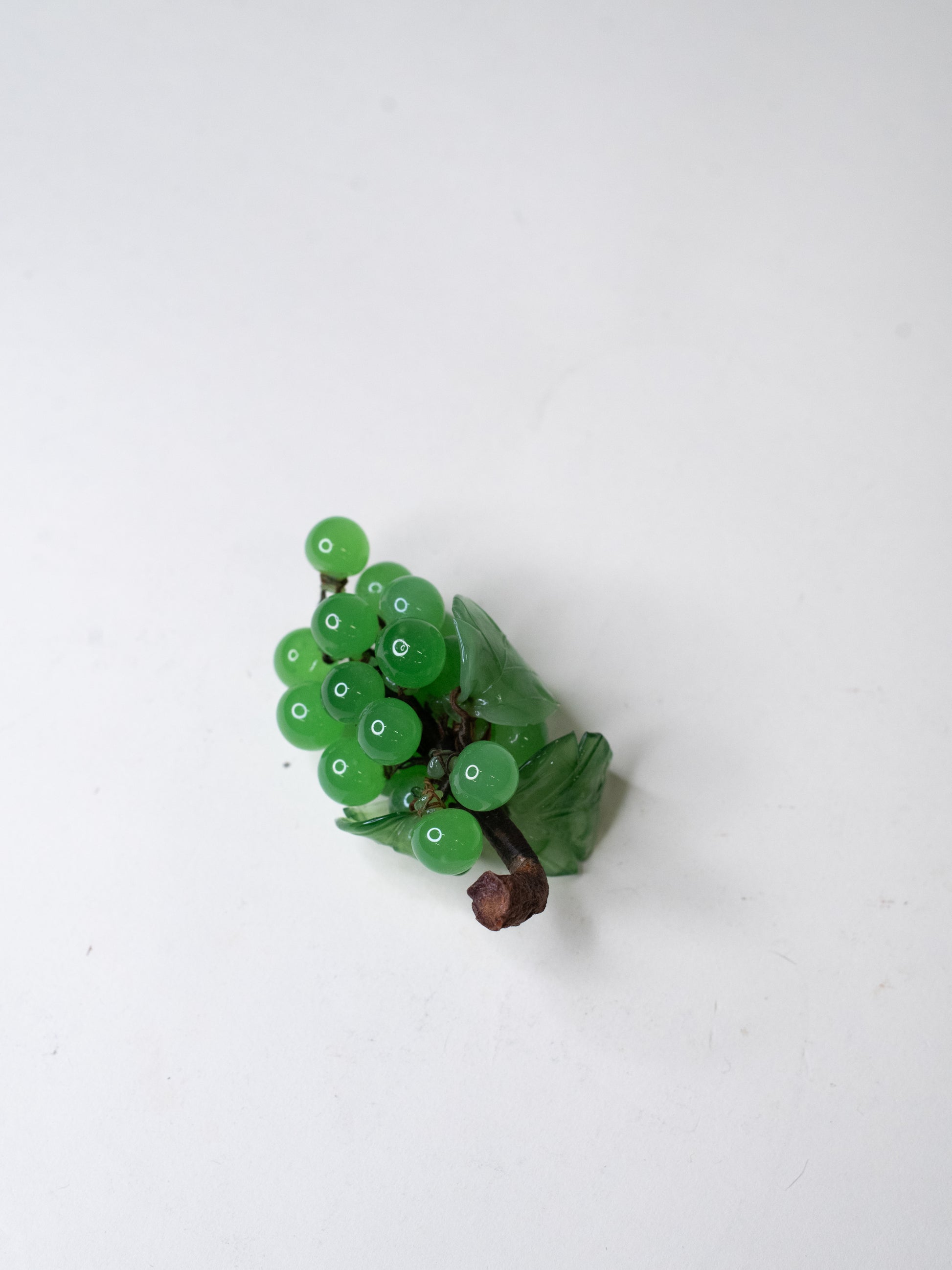 A small decorative grape cluster carved from green stone, complete with a twisted wire stem and thin stone leaves. The beads are likely nephrite jade - a material commonly used for mid-century gemstone fruit - giving the piece its smooth surface and even, luminous green tone.