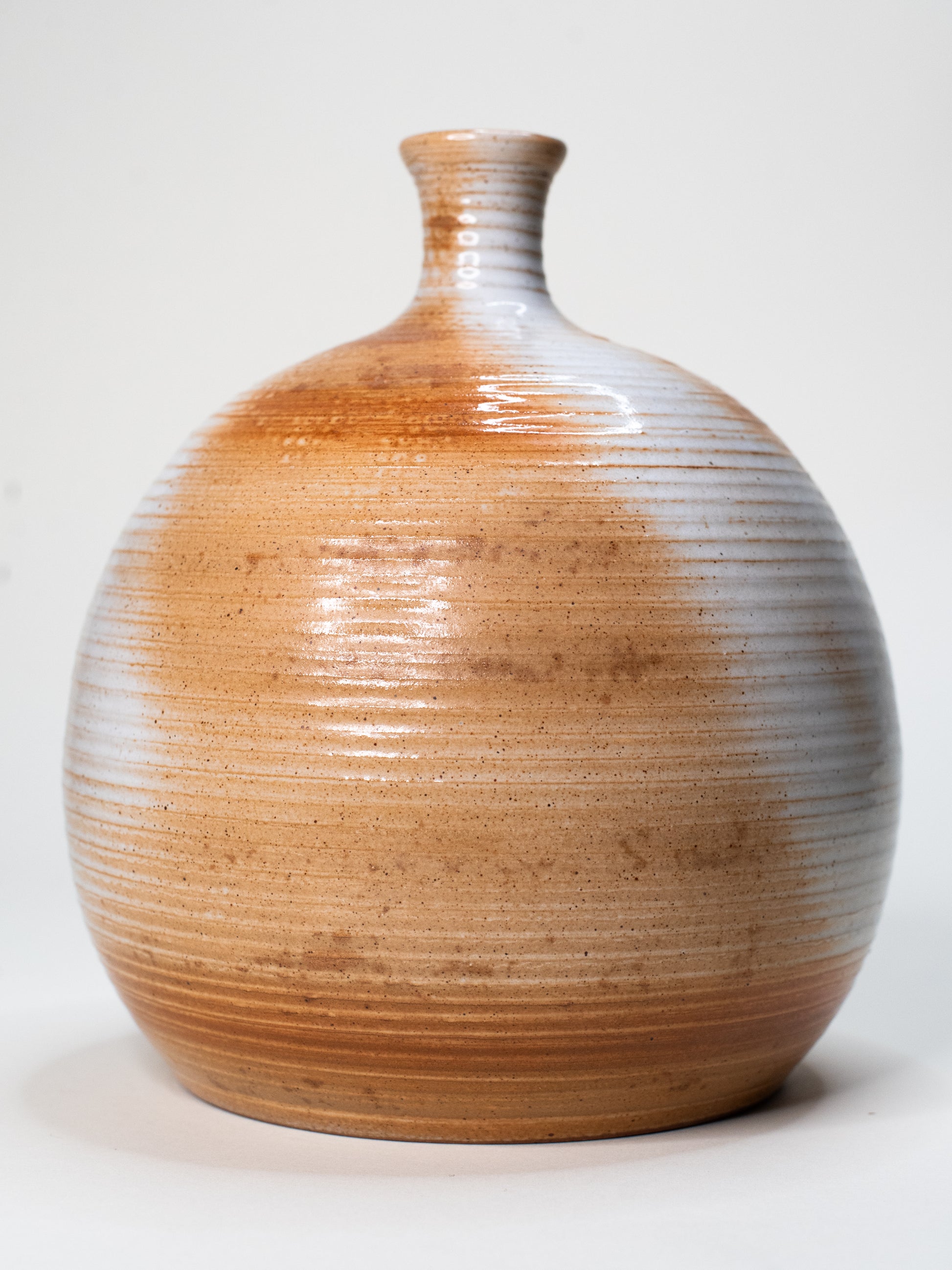 A beautiful hand-thrown French stoneware vase with a rounded, generous form and a narrow neck that gives the whole piece a calm, balanced presence. The glaze is gorgeous: warm earthy clay on one side, soft ash-white on the other, blending together in a natural gradient that shows off the wheel-thrown ridges underneath. Quietly expressive, tactile, and very much in the spirit of mid-century French studio pottery.