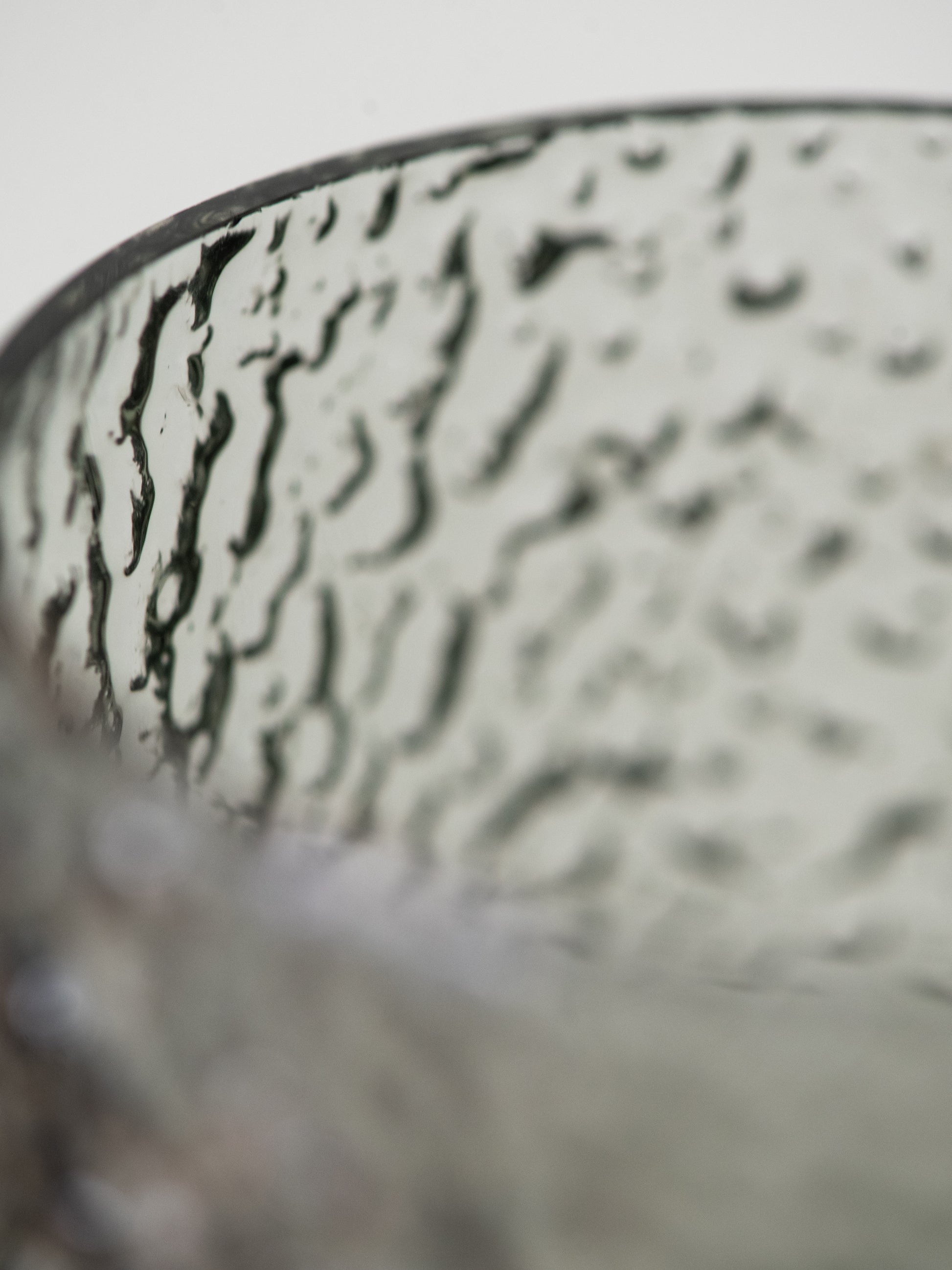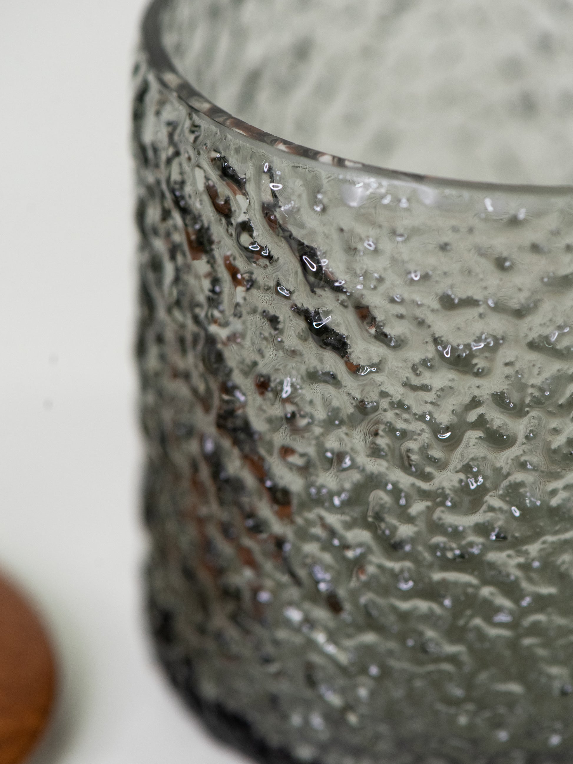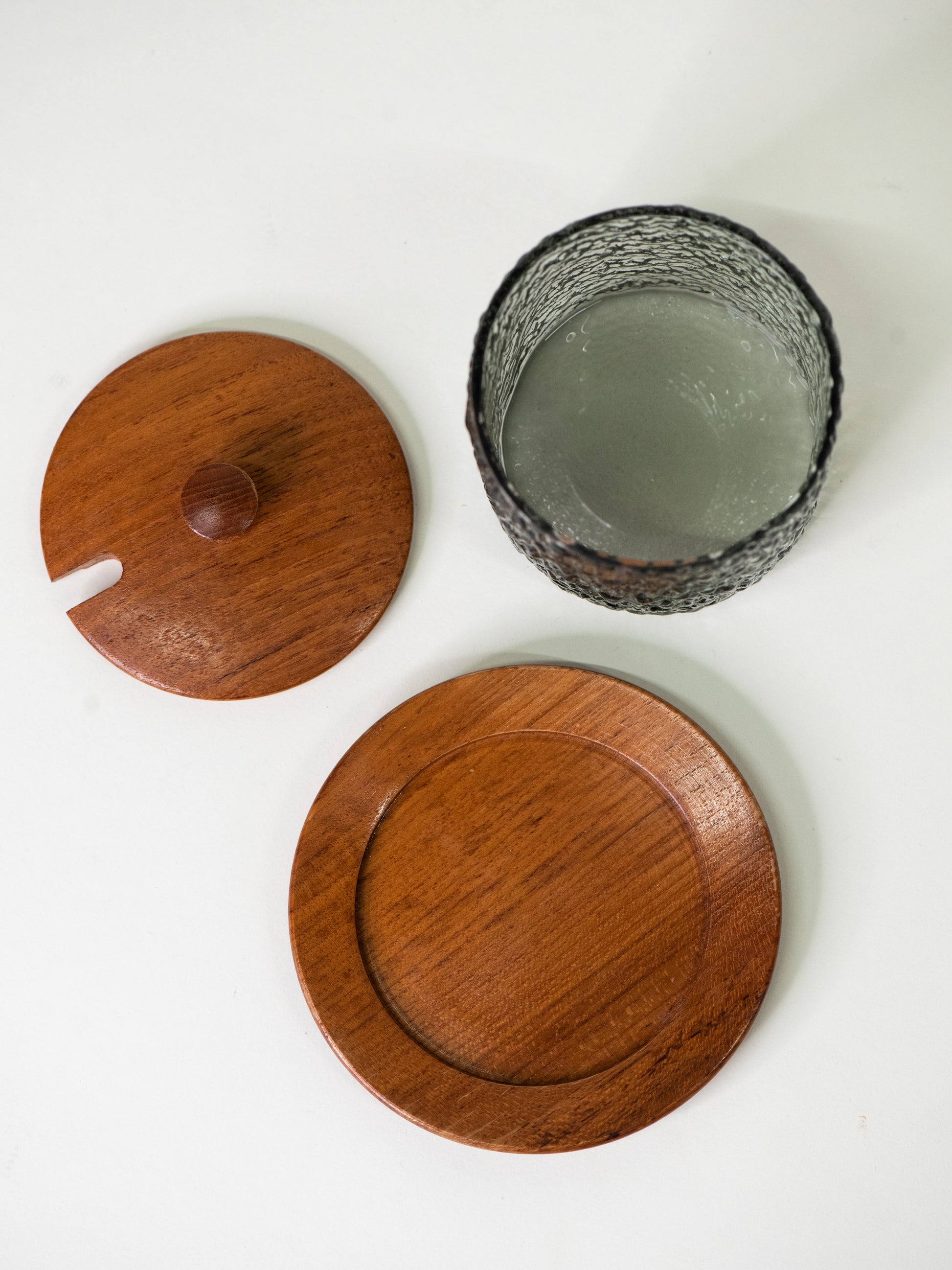 Vintage jar designed by Karl Holmberg and manufactured by his company, Karl Holmberg Götene AB in Sweden in the 1960's or 1970's. Made of high quality teak and heavily texturized smoke gray glass. Original stamp on the bottom.