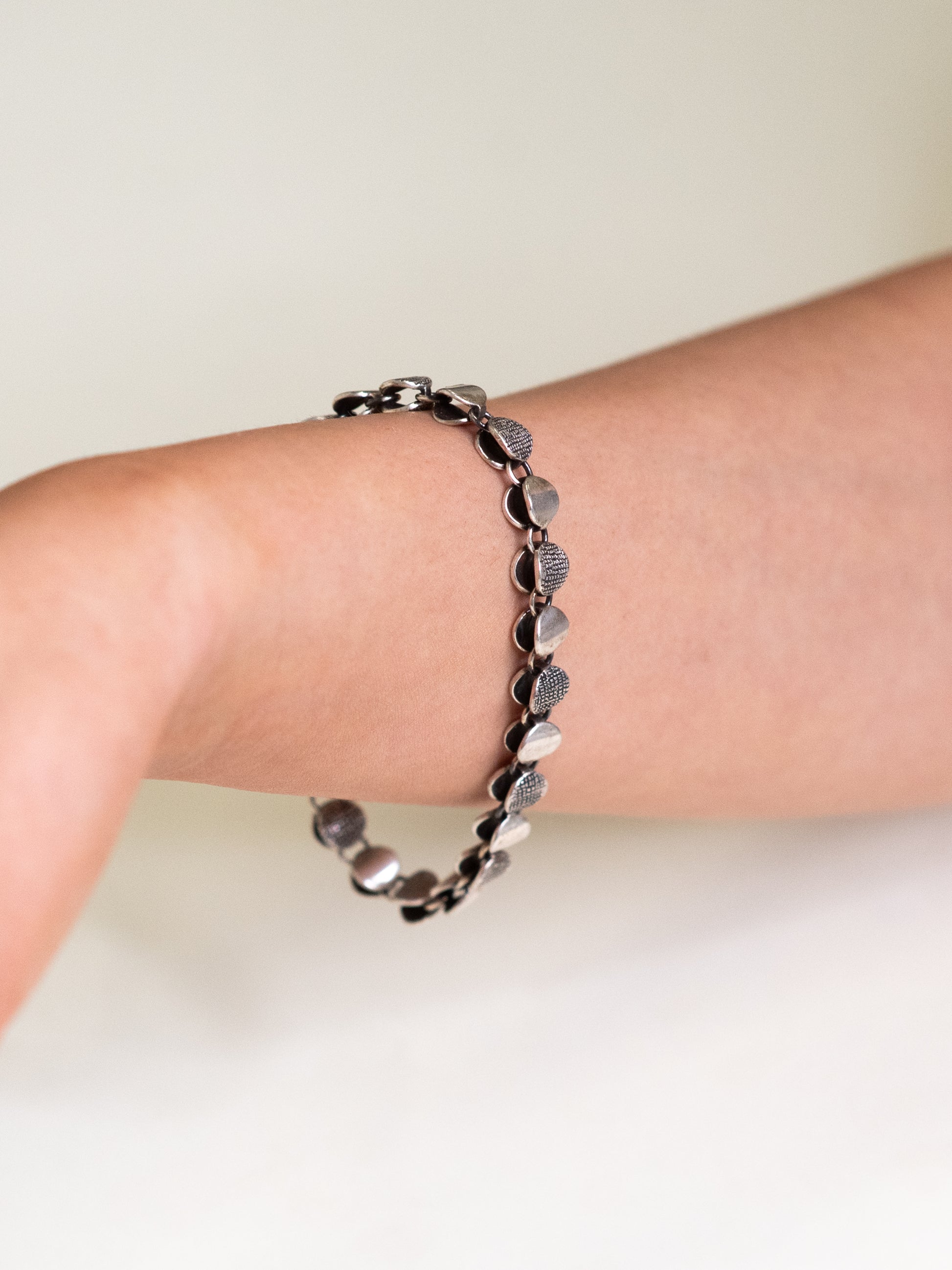 Texture meets refined minimalism in this vintage Finnish bracelet crafted by Kultateollisuus in the 1970's. Each alternating link features a different surface: smooth silver ovals are paired with richly textured, woven-like beads, creating a rhythmic and modernist feel.