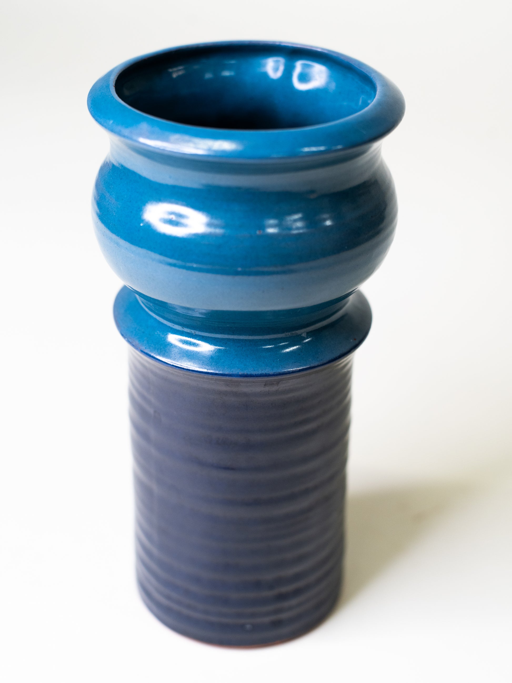 A tall, graphic vase in layered shades of blue, made by Kupittaan Savi in Finland. The form combines a tall base with a rounded upper section, finished in deep cobalt and bright turquoise glazes. At 18 cm tall, it has presence without overwhelming a shelf or table.