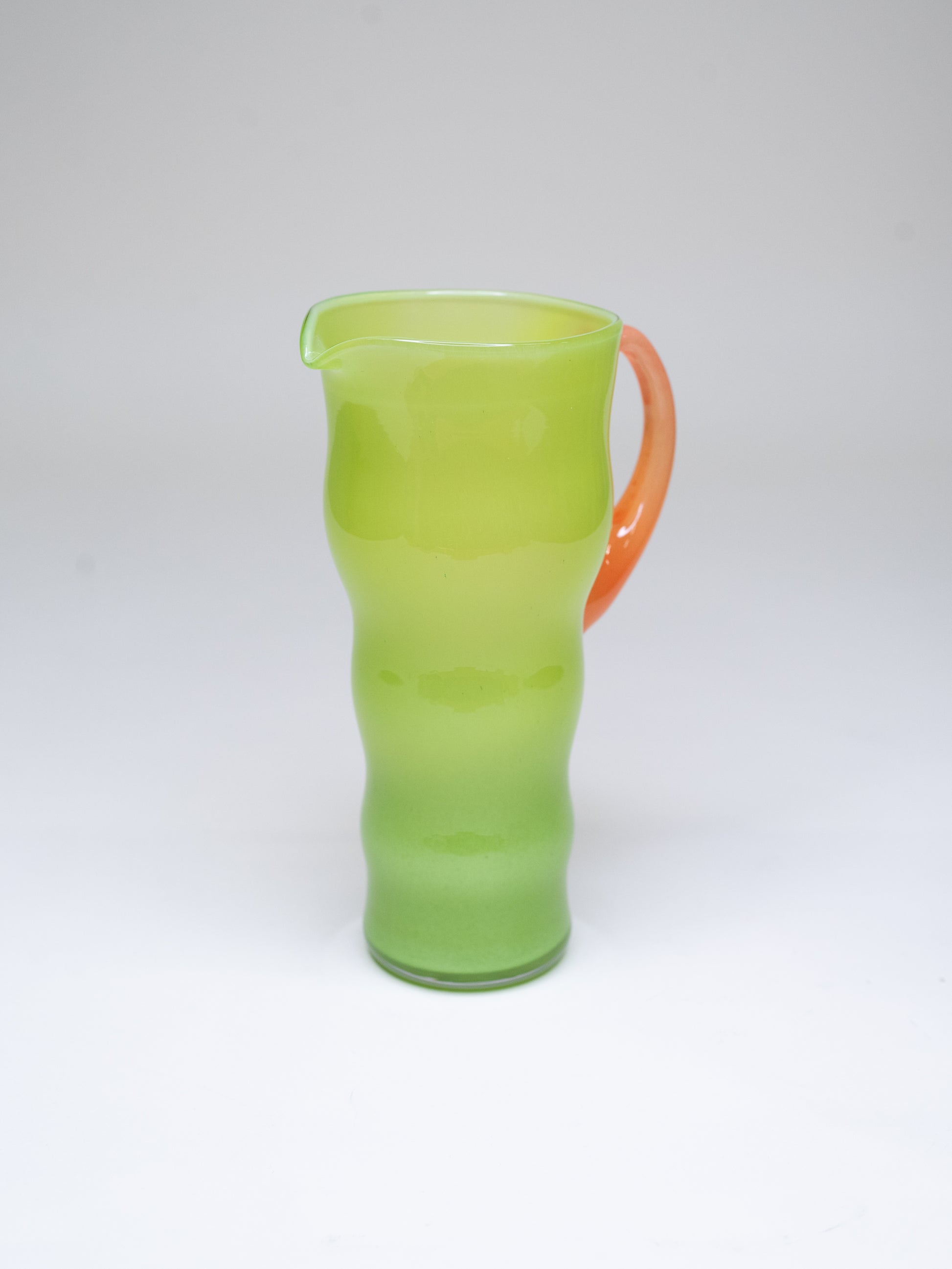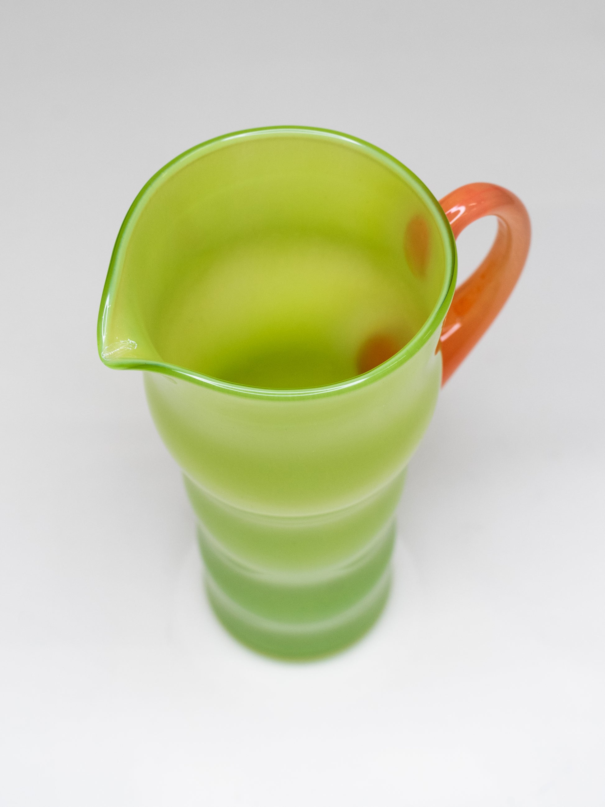 A tall, sturdy glass pitcher in vibrant tones. Made from lime green opaline glass with soft, milky depth and a contrasting orange handle.