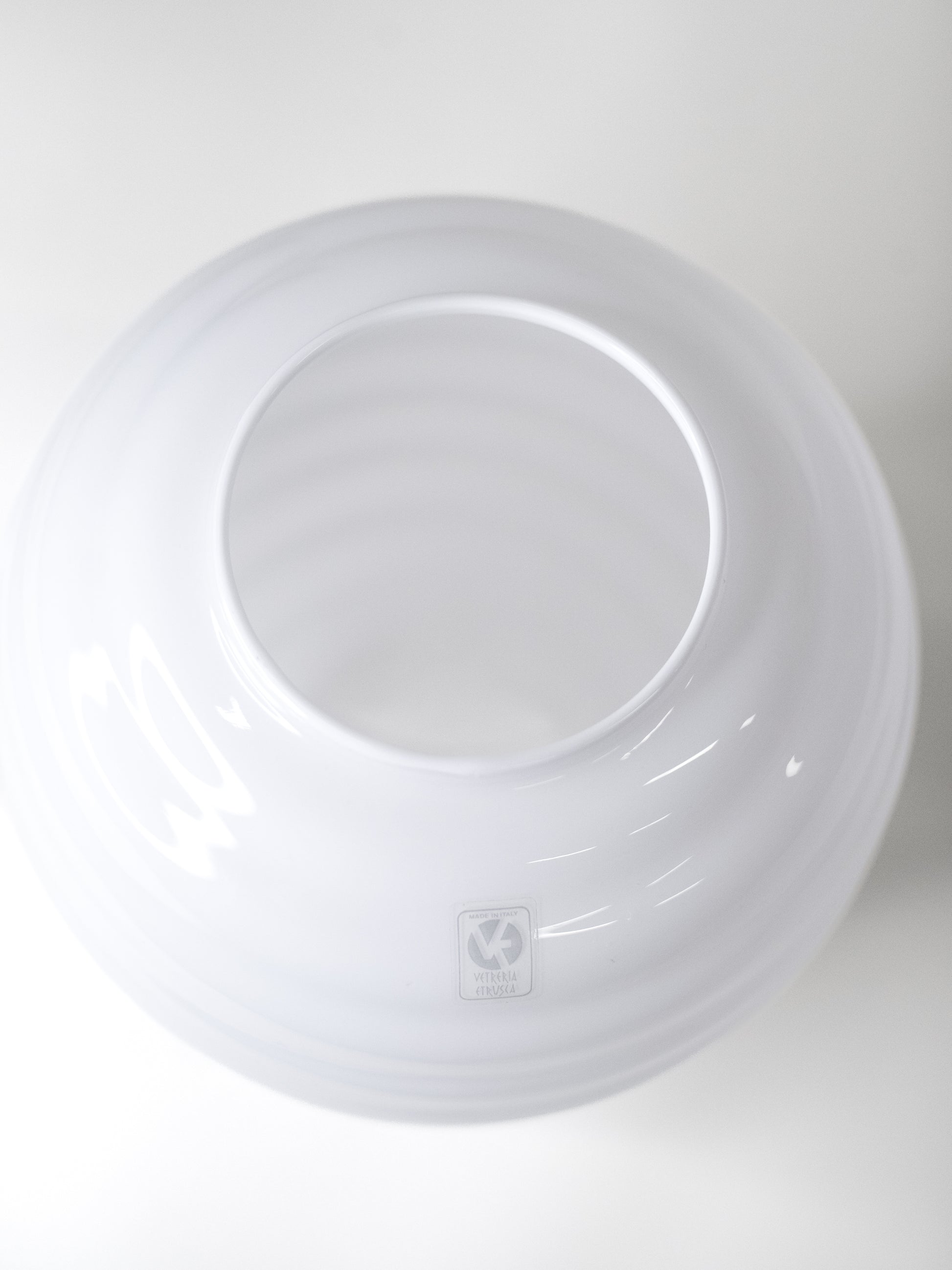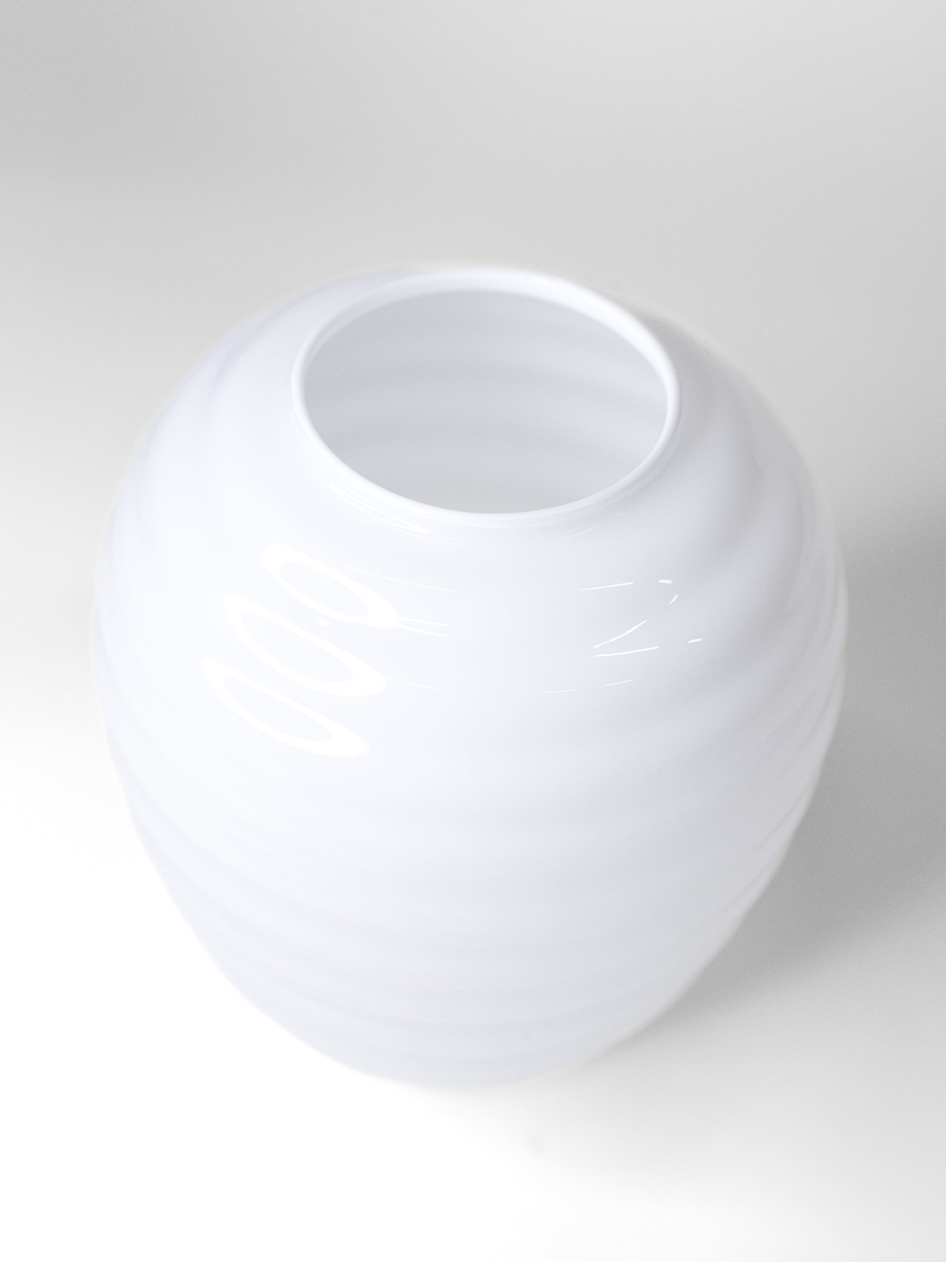A quiet, graphic piece of Italian glass. This Vetreria Etrusca vase stands 25 cm tall, with a rounded shape and gentle ribbed surface. Made of opaque white glass, it has a soft glow that feels calm, easy, and timeless.